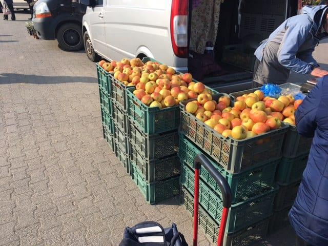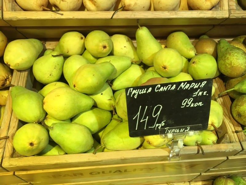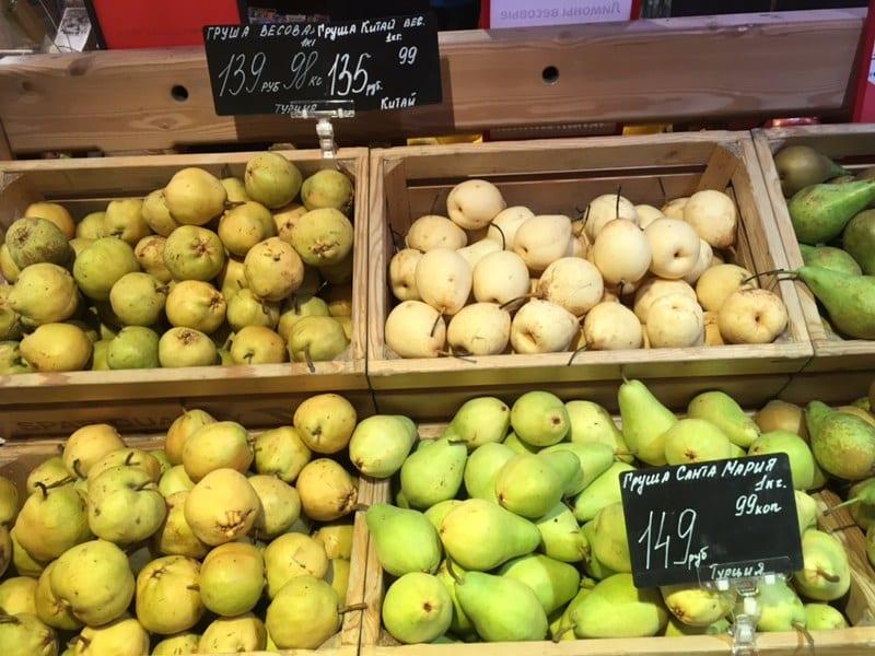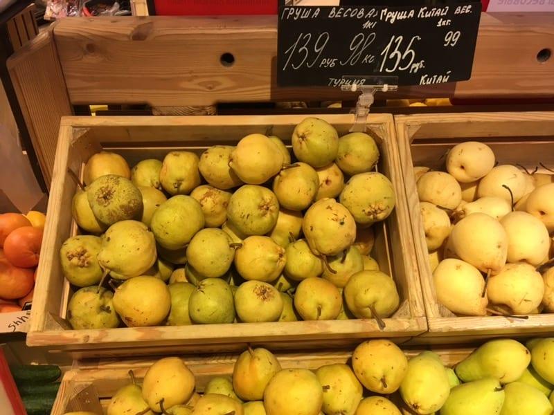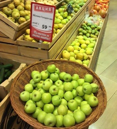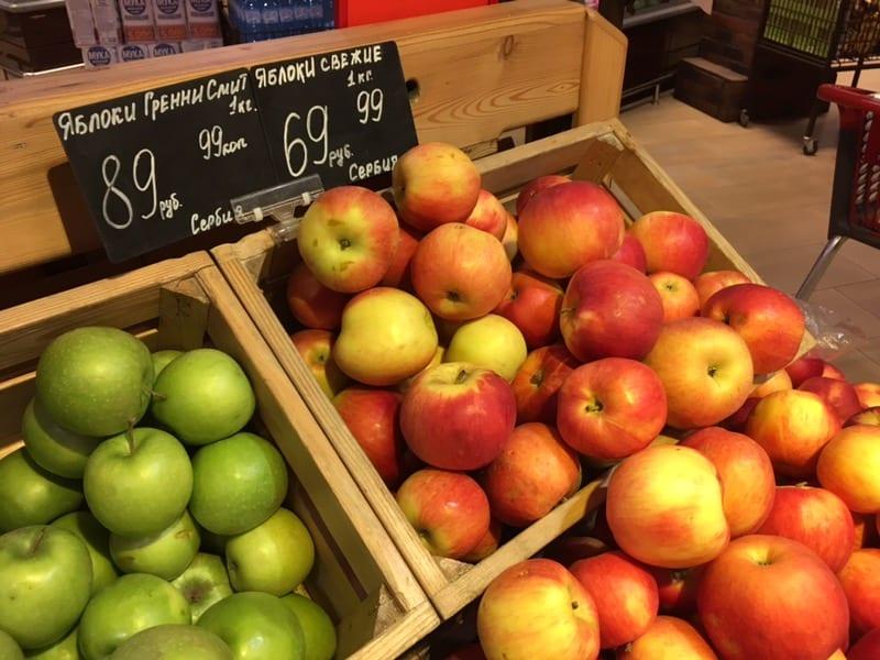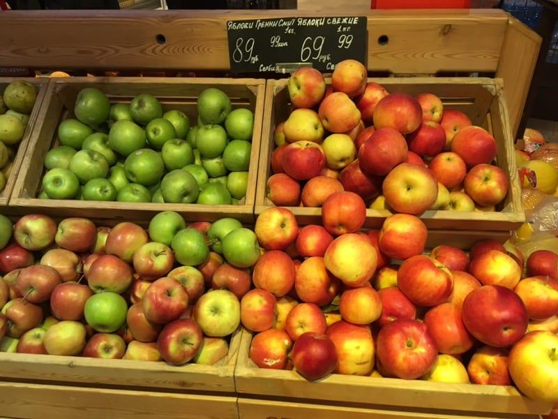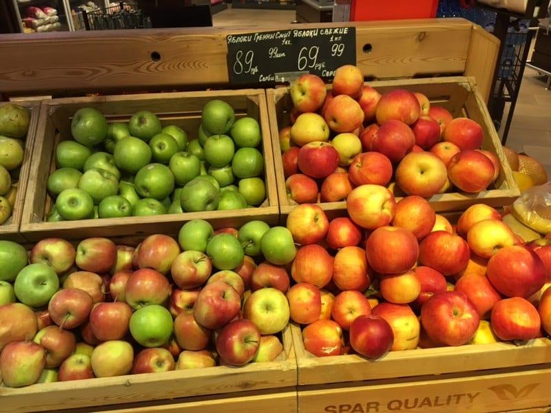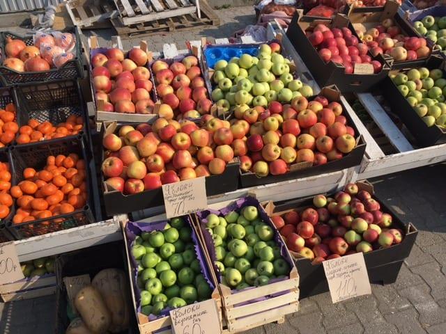 Migawki z obwodu kaliningradzkiego z 5 kwietnia 2019 - oferta jabłek z supermarketu Spar i w ulicznej sprzedaży. Jabłka w markecie pochodzą z Rosji, Serbii, Turcji i Chin. Te sprzedawane na ulicy wprost z samochodu według zapewnień sprzedawcy są rosyjskie i pochodzą z Kaliningradu - tyle że "sadzonki przyjechały z Polski" choć patrząc na opakowani i wybór odmian bardziej prawdopodobne jest że pochodzą z importu chociażby z Serbii. Dla ułatwianie przeliczania cen 1 PLN to około 17 rubli. Najtańszy w markecie był Golden - który w promocji kosztował 3,45 PLN, serbski Granny Smith kosztował 5,2 PLN. Ceny w sprzedaży ulicznej od 4 do 6,5 PLN