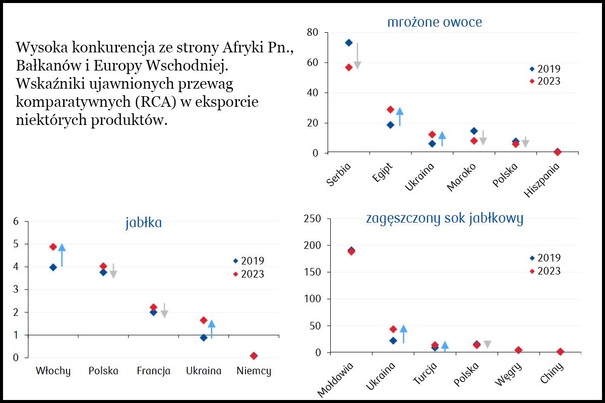 Polska wciąż odznacza się relatywnie wysoką konkurencyjnością w eksporcie produktów ogrodniczych oraz ich przetworów. Potwierdzają to na ogół wysokie poziomy ujawnionych przewag komparatywnych w eksporcie (RCA*), wynoszące powyżej 1 (wykres).