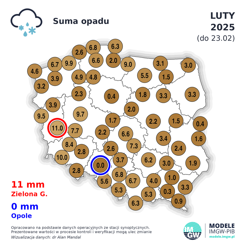 Jak wynika z danych IMGW, do 23 lutego miesiąc w całej Polsce jest suchy i bardzo suchy. W Opolu przez ponad trzy tygodnie w ogóle nie popadało. Tymczasem w Jeleniej Górze suma opadów wynosi 11 mm. To najwyższa wartość w całym kraju i stanowi zaledwie 31% wieloletniej miesięcznej normy.