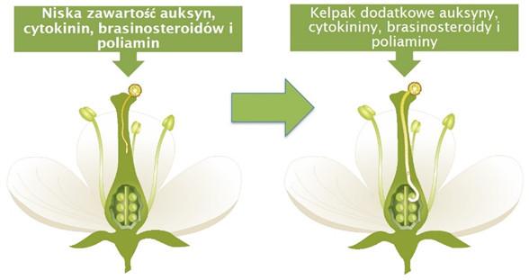 Auksyny produkowane są w wierzchołkowych organach młodych roślin, a następnie przenoszone do niżej położonych organów. Odpowiadają między innymi za tworzenie systemu korzeniowego i włośnikowego, co z sukcesem wykorzystano do procesu ukorzeniania młodych roślin. Dodatkową funkcją auksyn jest stymulacja procesów kwitnienia, zawiązywania (Rys. 1) oraz rozwoju owoców i przeciwdziałania ich przedwczesnemu starzeniu. Kluczowym zadaniem auksyn jest wpływ na prawidłowe pobieranie i transport wapnia. Wskazując zatem najwłaściwsze terminy aplikacji, należy mieć na uwadze stymulację procesów kwitnienia i zawiązywania owoców, szczególnie w sytuacjach stresowych.