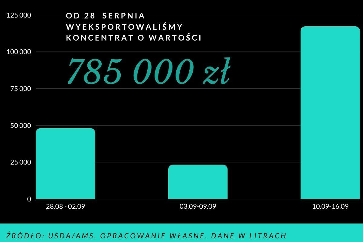 W porównaniu z analogicznym okresem ubiegłego roku wyraźnie wzrosły ceny europejskiego koncentratu jabłkowego w USA. Średnio jest to 22% w stosunku rok do roku. Jest to bardzo dużo biorąc pod uwagę, że Stany to największy importer koncentratu na świecie. W rezultacie mocno drożeje także produkt amerykański, który już teraz kosztuje nawet 11,30 zł/litr.