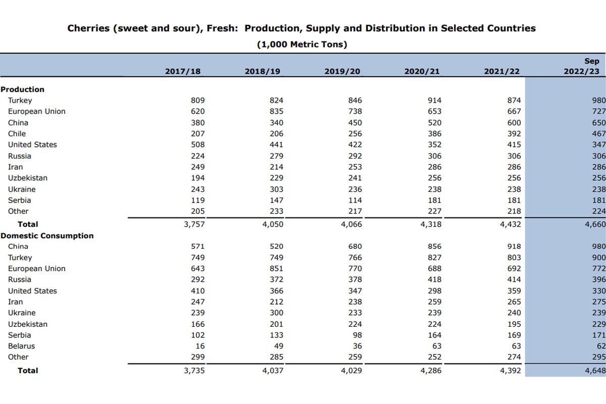 Światowa produkcja czereśni w tym roku wyniesie 4,7 miliona ton, a to przede wszystkim za sprawą szybko rosnącej produkcji Chile i w Turcji. W skali globalnej produkuje się z roku na rok coraz więcej czereśni. Zatem wyzwaniem dla branży w skali świata będzie stymulowanie konsumpcji i marketingu gatunku.