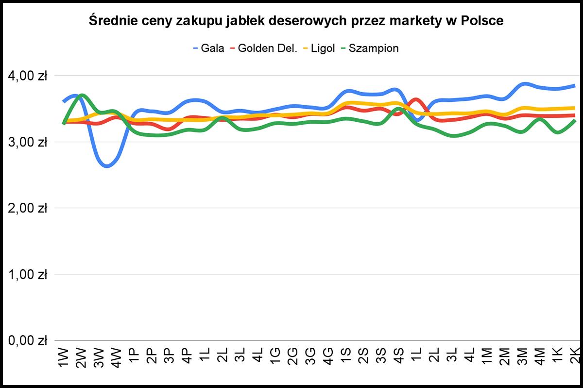 Jeśli spojrzymy na ceny, za jakie markety kupują jabłka to zobaczymy stabilizację przez cały sezon. W tym wypadku to jednak nic dobrego, ponieważ przez kilka miesięcy wzrosły koszty przechowania, odsetek odrzucanych owoców i co nie co zmieniło się na rynku.