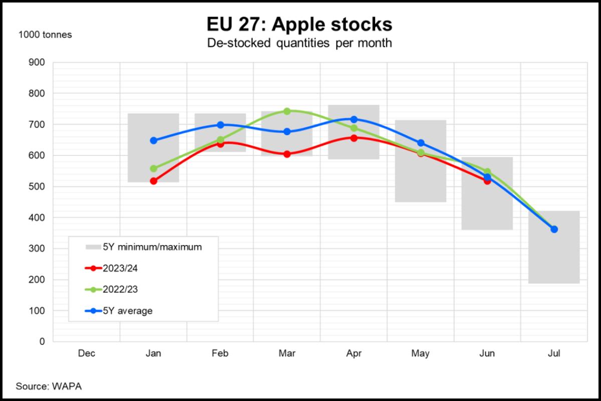 Problem pogłębia spadająca konsumpcja jabłek w Unii Europejskiej. W efekcie średnie ceny we Wspólnocie nie rosną w okresie letnim w tempie, jakie obserwowaliśmy w ostatnich latach.