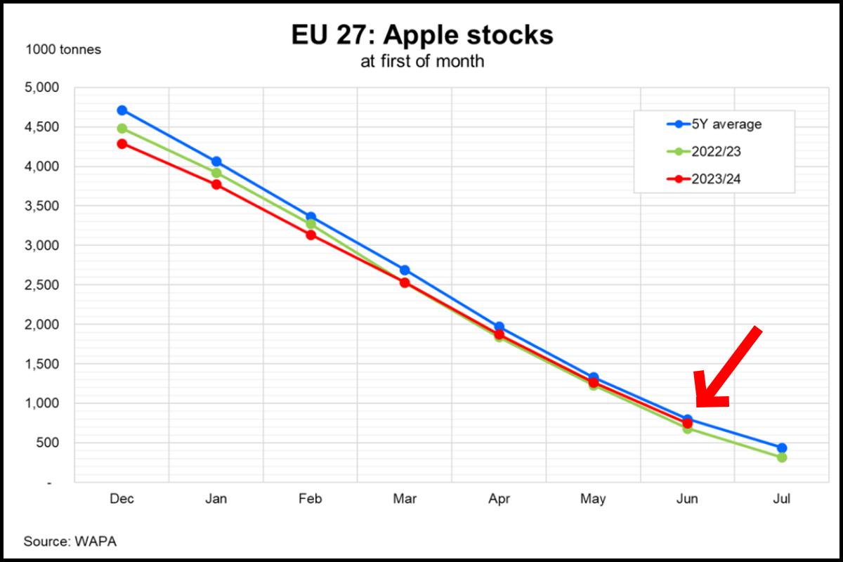 Efektem jest to, co widzimy na drugim wykresie. Na początku sezonu tegoroczne zapasy jabłek były niższe od zeszłorocznych. Jednak w czerwcu były już wyższe od ubiegłorocznych (czerwona strzałka).