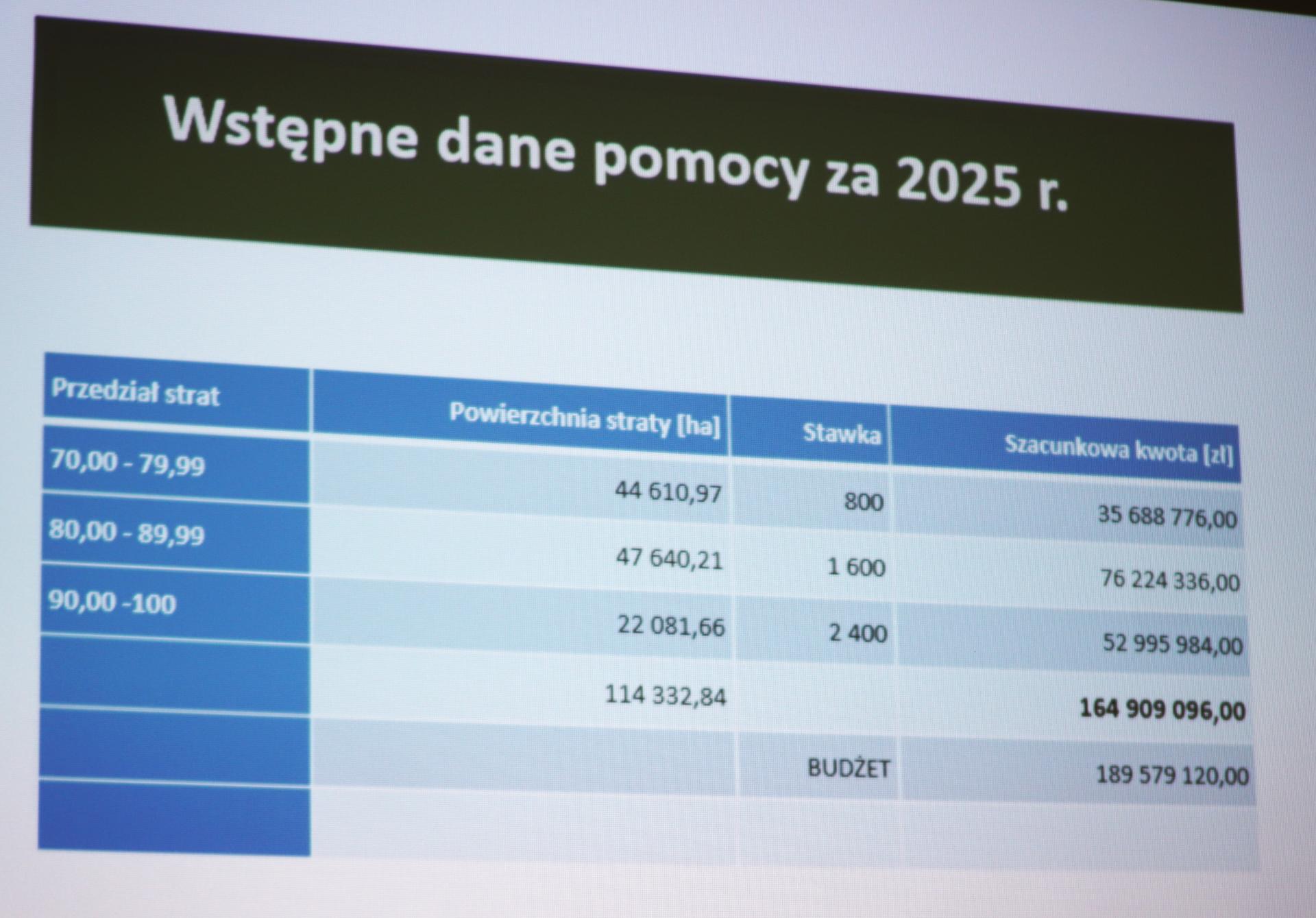 W tabeli zaprezentowanej przez panią dyrektor widzimy, że zdecydowanie najmniej deklarowanej powierzchni dotyczy najwyższego poziomu strat, od 90 do 100%. Widzimy również, że z całej puli środków niewykorzystane pozostanie dokładnie 24 670 000 zł.