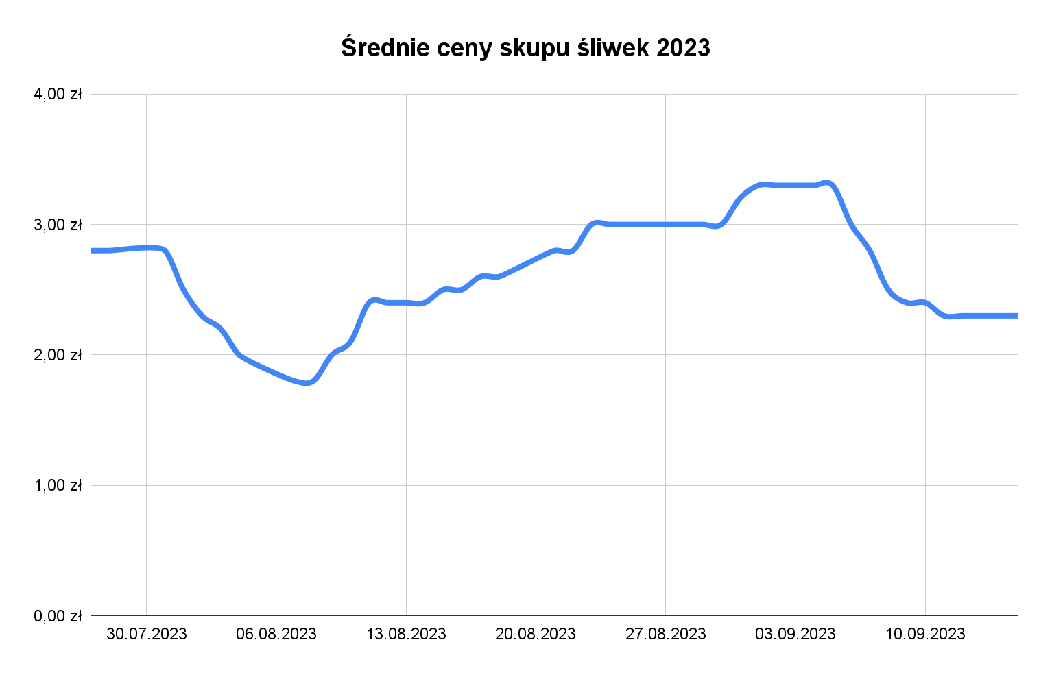 Sadownicy na początku sierpnia byli oburzeni spadkami cen. Widzimy je wyraźnie na wykresie niżej. Zbiory śliwek, w tym również Lepoticy, która była dostarczana na początku sierpnia, były znacznie niższe niż przed rokiem. Pomimo tego ceny skupu spadły w krótkim czasie z 3,00 nawet do 1,50 zł/kg.