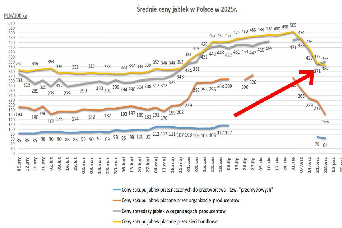 Bezprecedensowy „zjazd” cenowy, który markety zrealizowały we wrześniu, sprawia, że dziś popularne odmiany sadownicy sprzedają w cenie 1,20 zł/kg na sortowanie. Dotyczy to głównie Szampiona, Ligola i Jonagoreda. Do tego dochodzi nowy, kontrowersyjny mechanizm sieci Biedronka. Na szczęście nie zgodzili się na niego najwięksi dostawcy stawiając na szali współpracę z siecią.