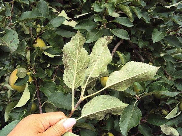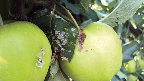 W przypadku ochrony jabłoni przed infekcjami powodowanymi przez parcha jabłoni, czy np. w sytuacji zagrożenia ze strony zwójki różóweczki (gąsienice tego gatunku po wylęgu rozchodzą się i zasiedlają głównie najmłodsze, dopiero rozwijające się listki), konieczne jest uwzględnienie tempa przyrostu blaszki liściowej i wieku liści. Powierzchnia liścia powiększa się czasami bardzo szybko, szczególnie w okresie kwitnienia drzew. Przyrost powierzchni liścia o ok. 100% (wiosną co około 4 dni) powoduje, że działanie naniesionego fungicydu czy insektycydu kontaktowego jest w pewnym momencie niewystarczające, ponieważ codziennie pojawiają się nowe, niezabezpieczone przyrosty, na tyle duże, że nawet rozmywanie niektórych preparatów kontaktowych (tzw. efekt pełzania preparatu – preparaty dodynowe i zawierające ditianon) nie może zabezpieczyć szybko przyrastającej tkanki. W przypadku fungicydu/insektycydu systemicznego intensywny wzrost liścia powoduje z kolei biologiczne rozcieńczenie preparatu.