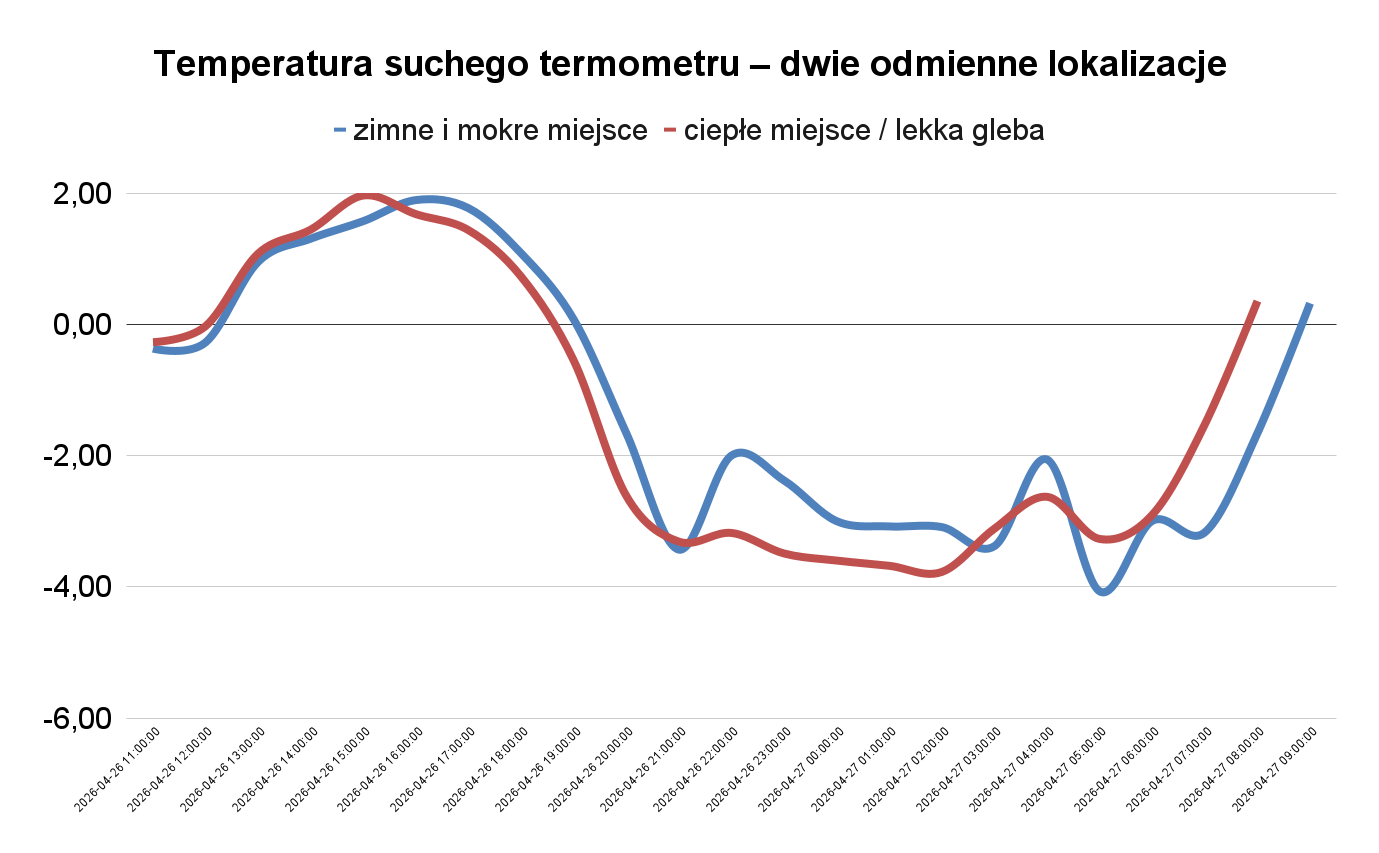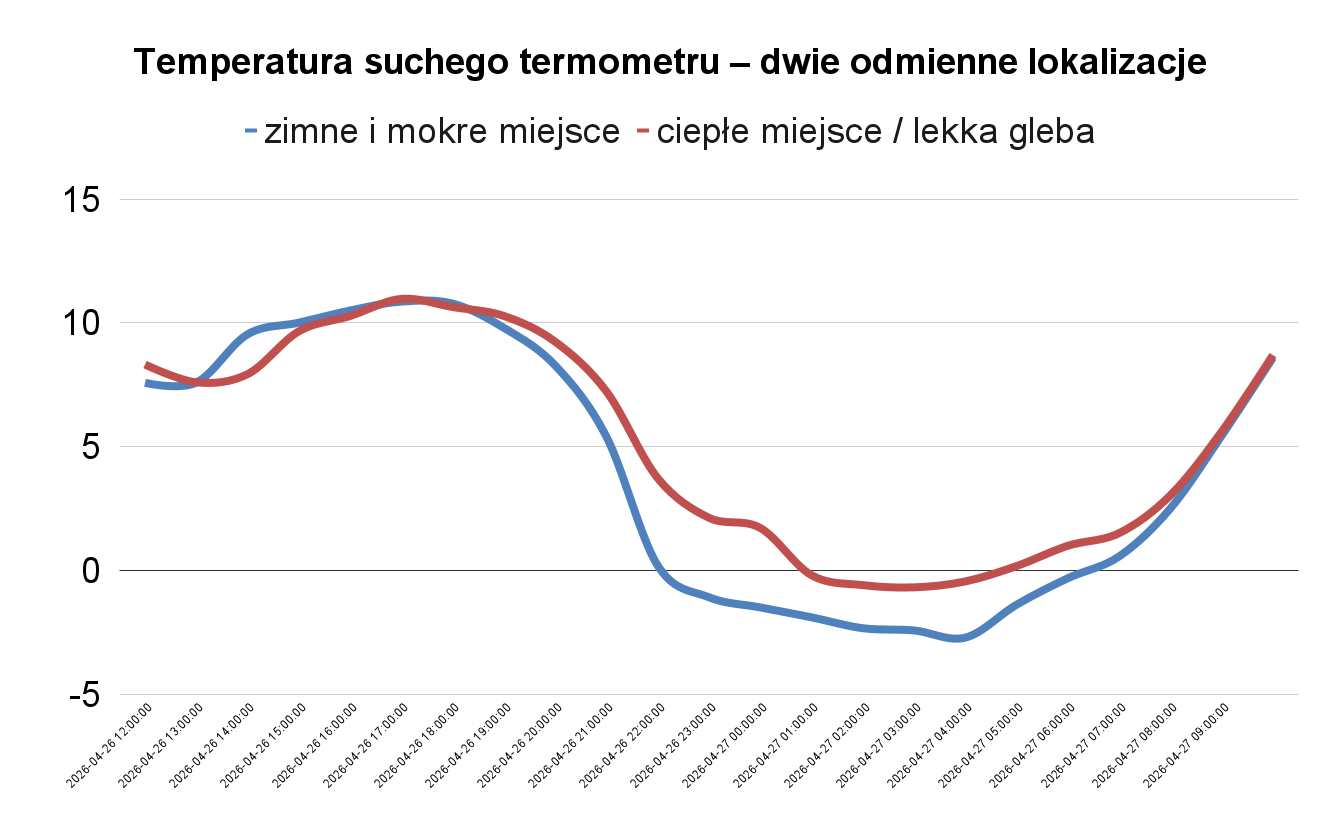 Wiemy również, że rośliny odczuwają temperaturę mokrego termometru. W takich nocach, jak noc z niedzieli na poniedziałek, była ona kluczowa. Dla rośliny jest to najniższa temperatura, jaką może osiągnąć jej powierzchnia w wyniku parowania wody. Jest to zatem kluczowy wskaźnik rzeczywistego ryzyka przymrozków.