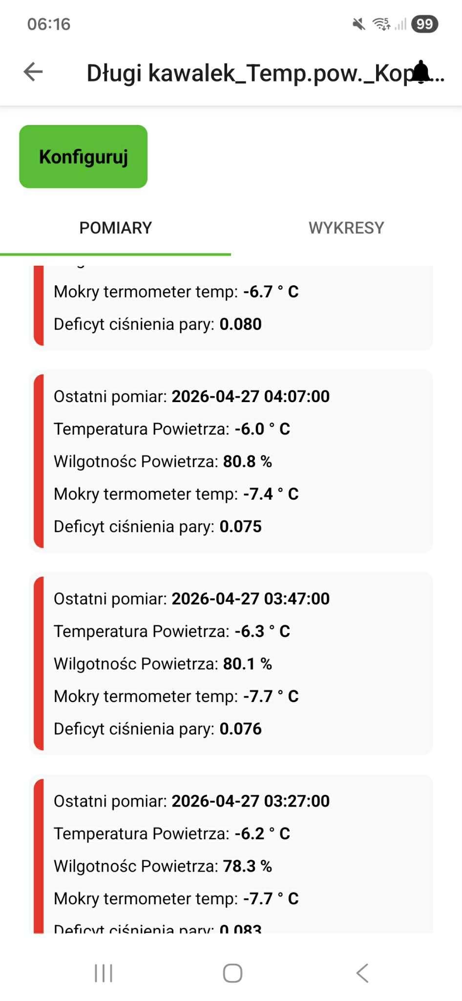 Na podstawie dość skomplikowanego wzoru prezentujemy dwa wykresy. Na pierwszym pokazujemy odczyt suchego termometru dla obu stacji. Na drugim – analogicznie – odczyt mokrego termometru dla obu stacji.