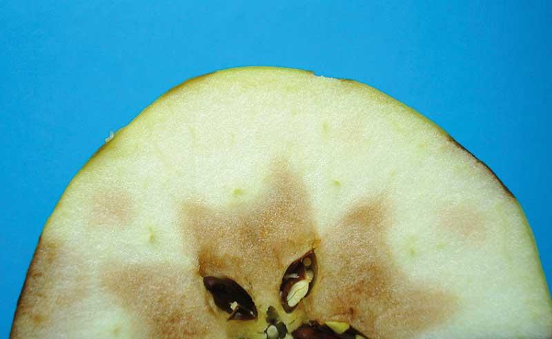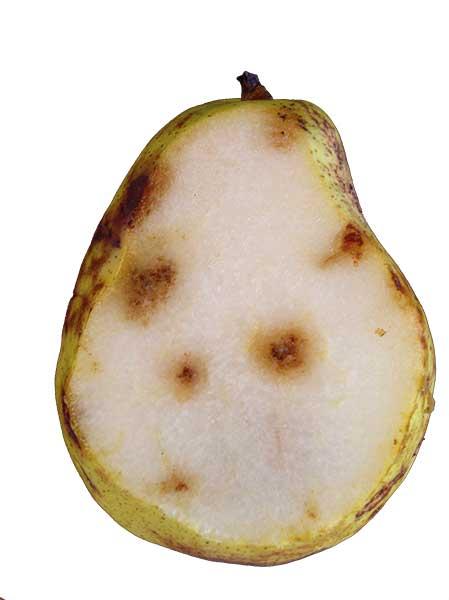 W celu ograniczenia występowania w jabłkach i gruszkach chorób fizjologicznych, których objawy pojawiają się wewnątrz miąższu (np. zbrunatnienie przygniezdne – fot. 3, szklistość miąższu u jabłek – fot. 4 oraz skorkowacenie – fot. 5 i zbrązowienia miąższu u gruszek), wskazane jest rozpocząć opryskiwanie wapniem w połowie czerwca, gdy zawiązki owocowe mają wielkość orzecha włoskiego. Zabiegi w późniejszym okresie wzrostu owoców ograniczają choroby fizjologiczne, których objawy występują na skórce lub tuż pod nią (np. gorzka plamistość podskórna – fot. 6 i plamistość przetchlinkowa u jabłoni oraz lucernowatość u gruszek – fot. 7). Opryskiwanie wapniem u brzoskwini i moreli należy rozpocząć około 4 tygodnie przed zbiorem owoców, a kolejne zabiegi wykonywać w odstępach 7–14-dniowych (częściej u brzoskwini i moreli, rzadziej u gruszy i jabłoni).