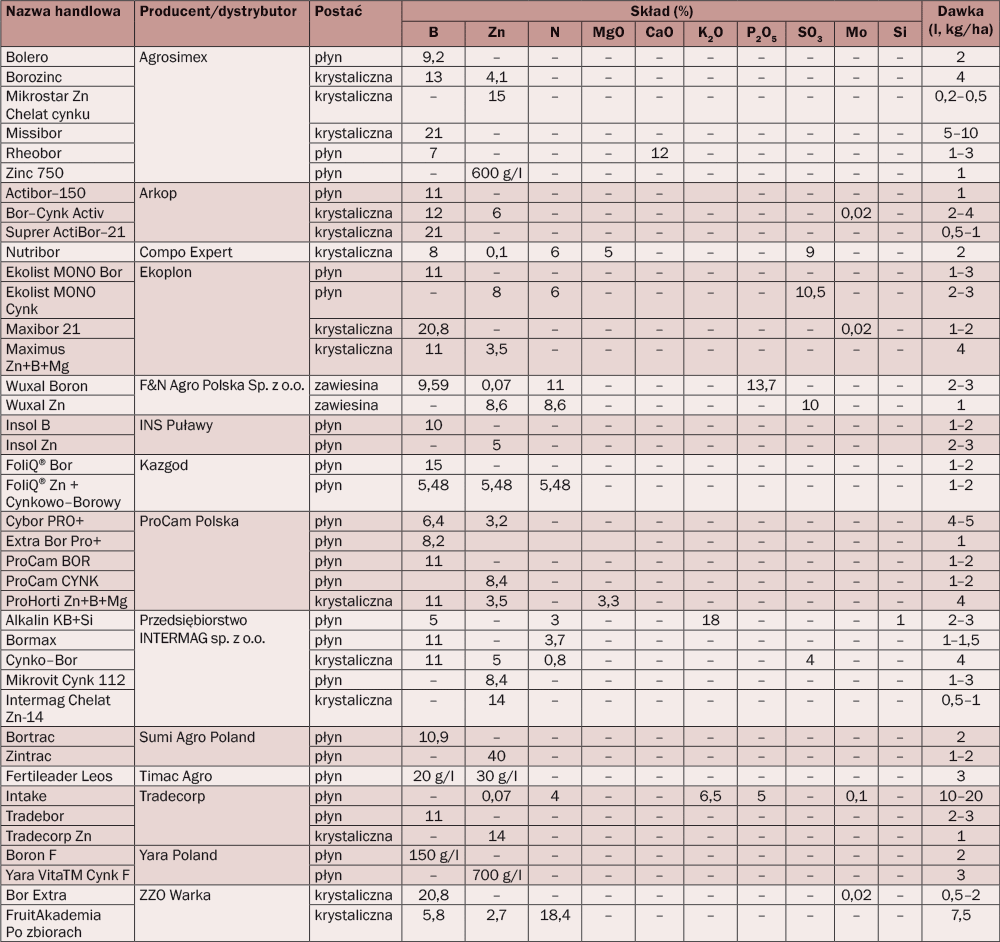Bor i cynk wolno przemieszczają się w roślinie, dlatego ważne jest dolistne dostarczenie tych składników jesienią, jak najszybciej po zbiorach owoców, aby były przez liście pobrane i zakumulowane w tkankach.