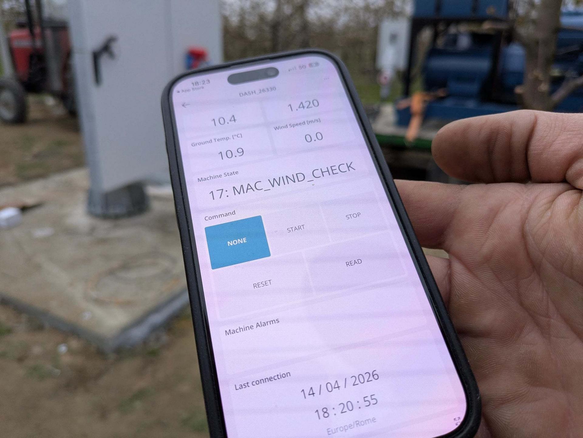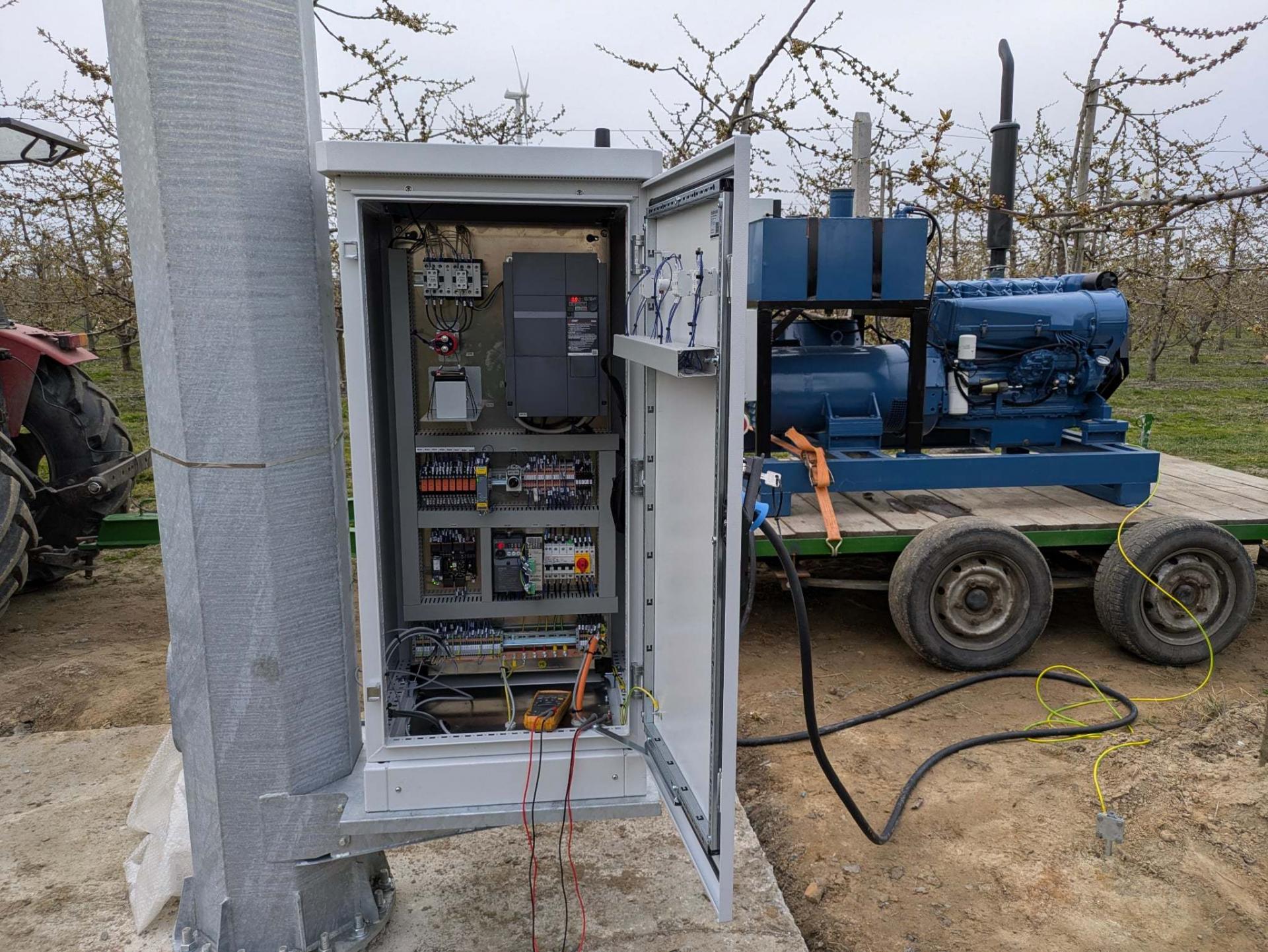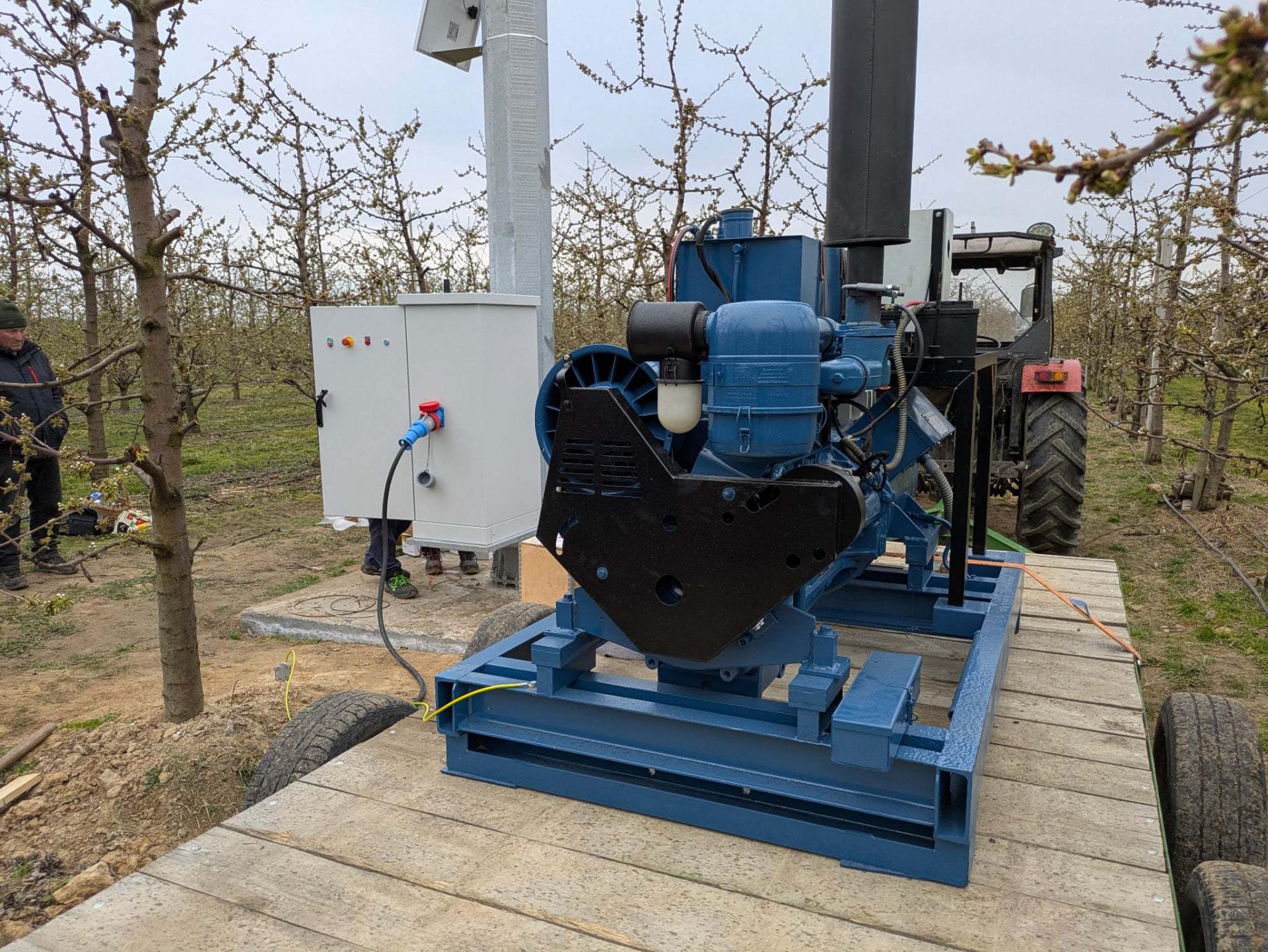 To włoska maszyna elektryczna marki Aria, w tym przypadku zasilana agregatem, która ma chronić sad czereśniowy. Sadownicy postawili na urządzenie z silnikiem o mocy 25 kW, zamontowanym na szczycie wieży. To napęd bezpośredni, bez przekładni kątowych i skrzyni biegów, co ogranicza straty mocy. Zużycie paliwa w przypadku generatora szacowane jest na około 8 litrów na godzinę.
