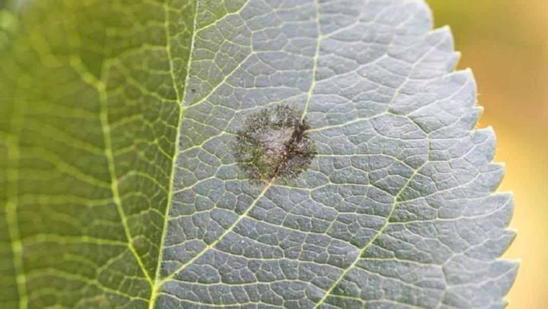[caption id="attachment_4265" align="alignnone" width="1280"] Fot. 1. Świeże, intensywnie zarodnikujące plamy parcha jabłoni... na 5, 4, 3 i 2 liściu...