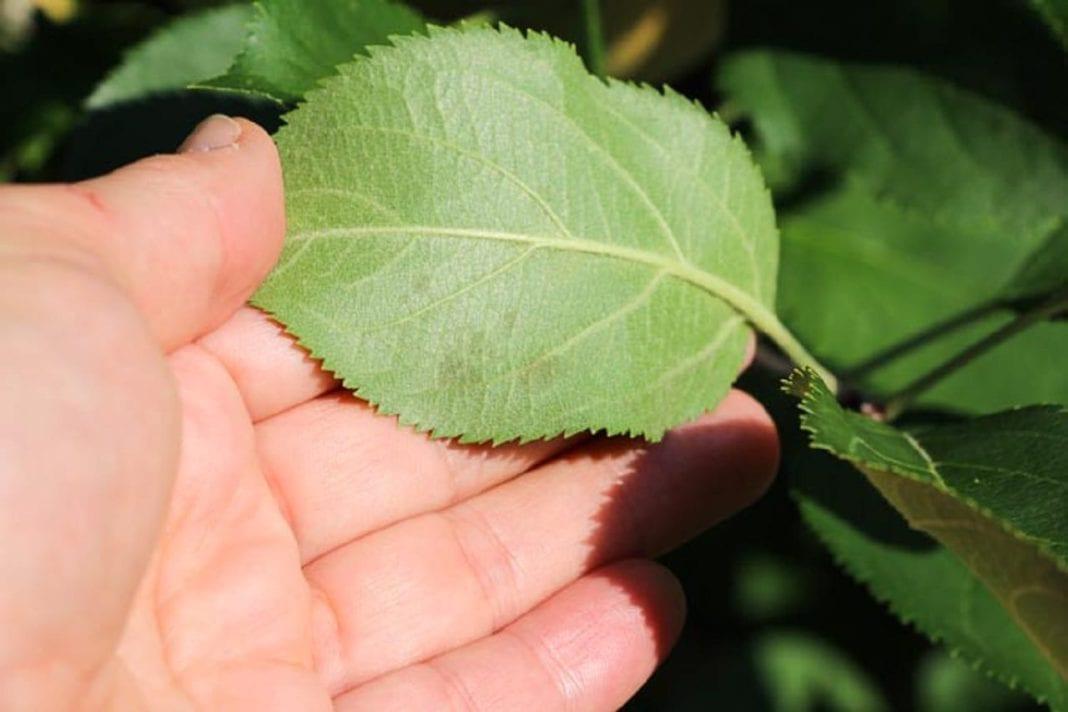 Świeże plamy parcha w sadach jabłoniowych (bez jego objawów z infekcji pierwotnych) można łatwo zauważyć na 5, 4, 3 i 2 liściu licząc od końca pędu jednorocznego (fot. 1).