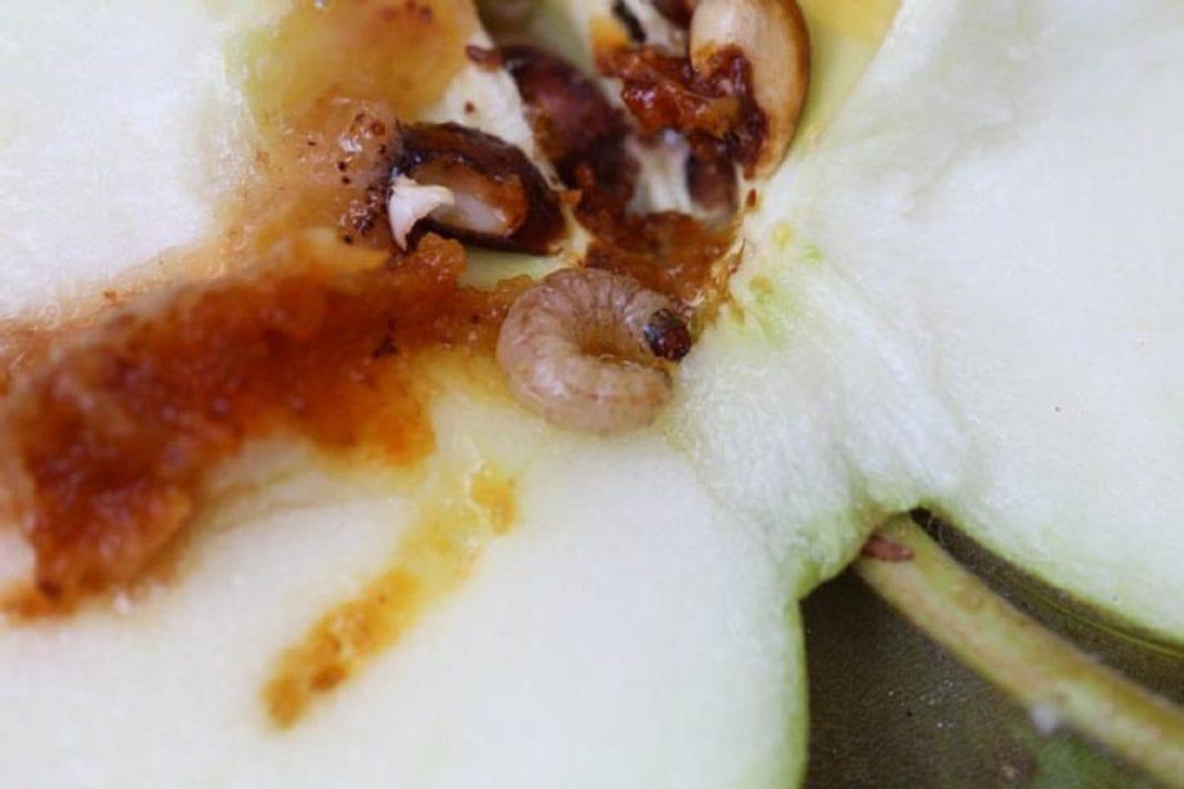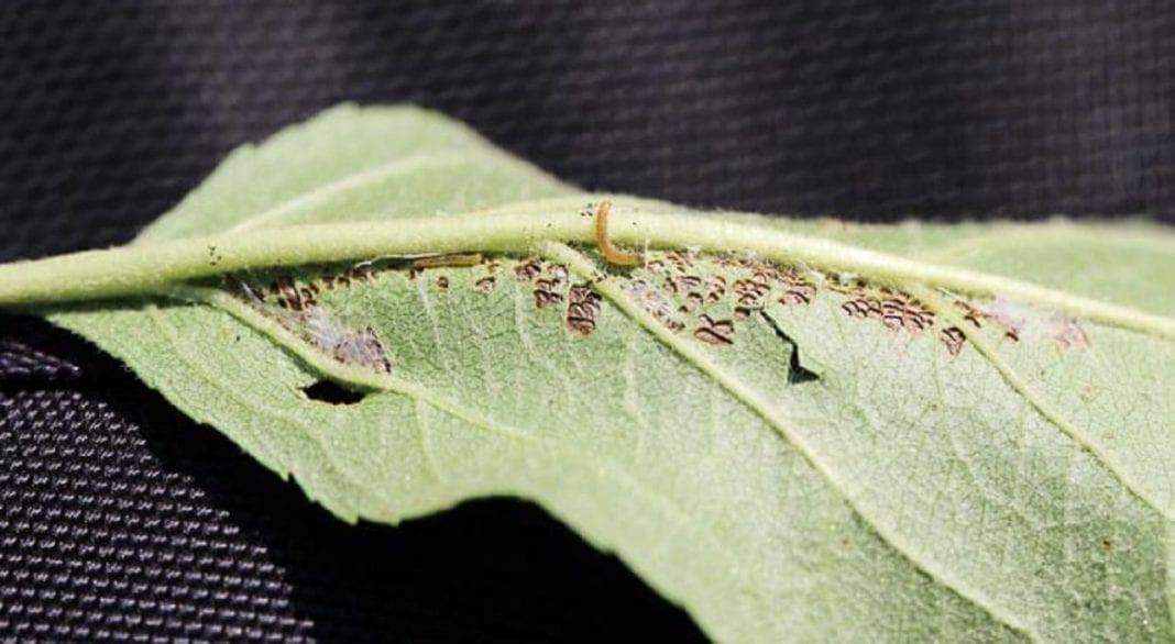 Ze szkodników dość licznie występują zwójki liściowe. Są one bardzo małe i ukrywają się pod liśćmi przy owocach (fot. 6) lub w zagięciach liści wzdłuż nerwu głównego (fot. 7). Są one dość aktywne. Czy zwalczać je? Myślę, że na obecną chwilę tak. Niektóre jabłka będą zbierane dopiero w drugiej połowie września i w październiku, a do tego czasu gąsienice zwójek mogą dokonać jeszcze wielu uszkodzeń owoców. Do zwalczania tych szkodników trzeba jednak wybrać preparat np. wgłębny (np. Affirm 095 SG lub Coragen 200 SC), bo zwójki ukrywają się w oprzędach oraz o bardzo krótkim okresie karencji i dobrze zwalczający młode stadia gąsienic L1-L3 (np. Affirm 095 SG o 3 dniach karencji, Steward 30 WG i Rumo 30 WG o 7 dniach oraz Coragen 200 SC i Runner 240 SC o 14 dniach karencji).