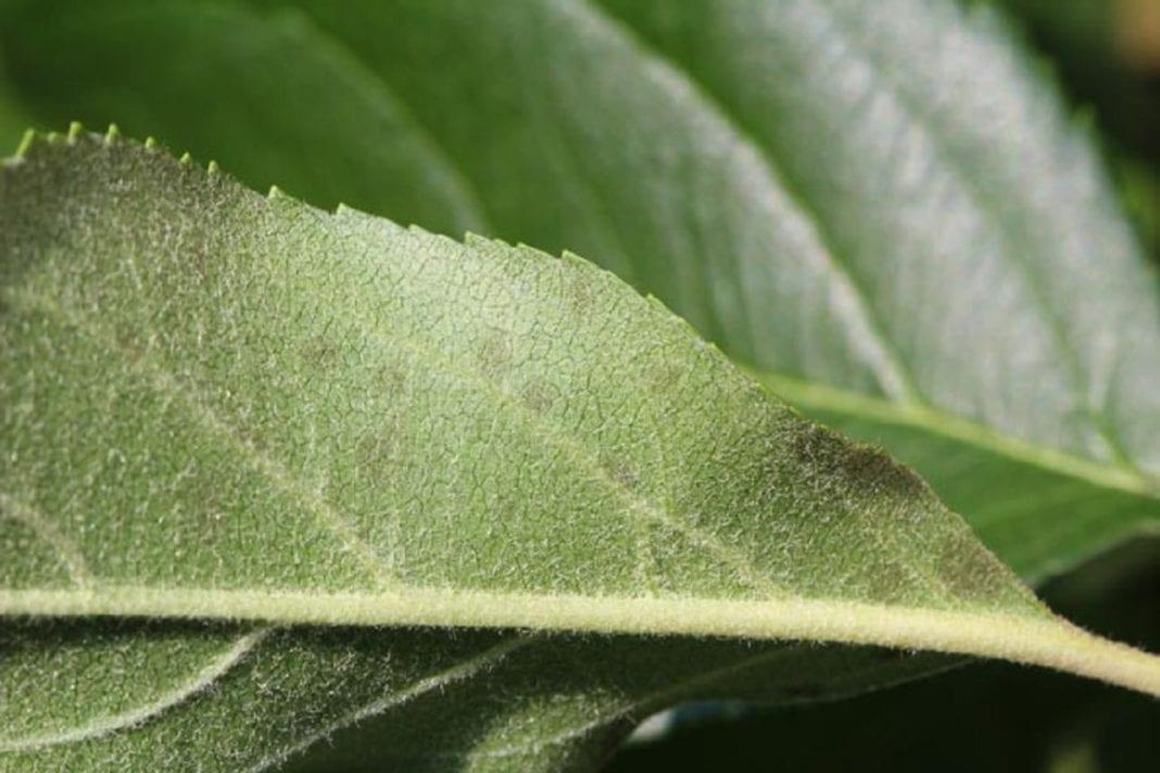 Fot. 1. Świeże, intensywnie zarodnikujące plamy parcha jabłoni... na 5, 4, 3 i 2 liściu...