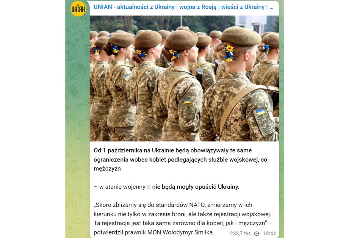 Od 1 października na Ukrainie w życie wchodzą nowe przepisy. Kobiety zdolne do służby wojskowej nie będą mogły opuszczać terytorium kraju. Na szczęście według doniesień ukraińskich mediów do końca 2022 r. państwo nie będzie karać kobiet, które zignorują rejestrację wojskową.