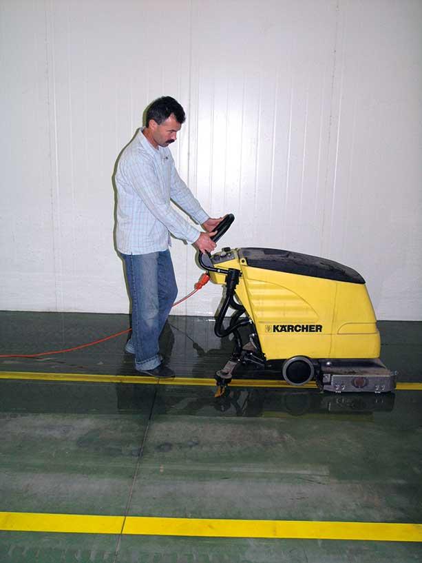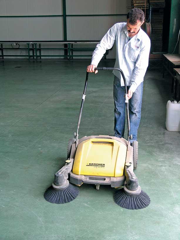 Po sezonie przechowalniczym komory należy posprzątać, umyć i zdezynfekować. Te czynności wykonujemy, kiedy komory są puste, a brud na podłogach jeszcze nie zasechł. Zwykle są to miesiące letnie (lipiec, sierpień). Najpierw zmiatamy podłogi. Można to robić szerokimi miotłami, a w większych obiektach zamiatarkami mechanicznymi (fot. 3).