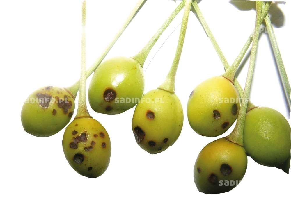 W ub.r. obserwowałam poparzone nieodpowiednim środkiem chemicznym pędy, które były pobrane z sadu wyglądającego, jakby uległ spaleniu lub silnemu porażeniu zarazą ogniową. Liście były brązowe, a końce pędów zawijały się pastorałowato. Jednak zmiany te dotyczyły tylko tego sadu, w sąsiednich nie było żadnych oznak chorobowych. Po kilkudniowym przetrzymaniu chorych pędów w eksykatorze, w warunkach wysokiej wilgotności, porażone pędy i liście pokryły się m.in. zarodnikującą grzybnią Alternaria spp., patogenem często zasiedlającym martwe tkanki oraz grzybnią Phoma spp., wywołującym zgniliznę owoców podczas przechowywania.
