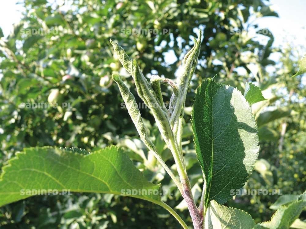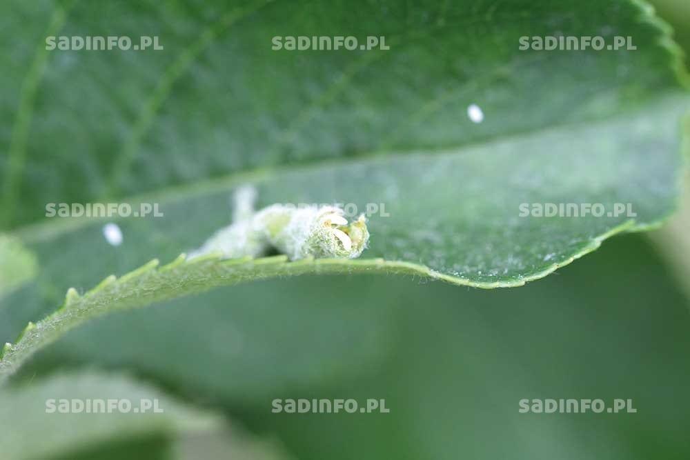 Szkodnikiem, który od kilku sezonów występuje w znacznym nasileniu jest pryszczarek jabłoniak. Objawem jego bytowania i żerowania są charakterystycznie zwinięte brzegi liści jabłoni (fot. 10). Owad dorosły jest maleńką muchówką, natomiast stadium szkodliwym są beznogie, białe, a później żółte lub różowopomarańczowe larwy, żerujące gromadnie. Największe szkody wyrządzają one w szkółkach i młodych nasadzeniach, natomiast stosunkowo niewielkie w przypadku starszych nasadzeń. Stadium zimującym są larwy w kokonach, w wierzchniej warstwie gleby. Samice wylatują w kwietniu i składają liczne jaja na brzegach liści. Wylęgające się larwy wysysają z nich soki, co powoduje ich zwijanie się. W ciągu roku występują 3 pokolenia szkodnika.