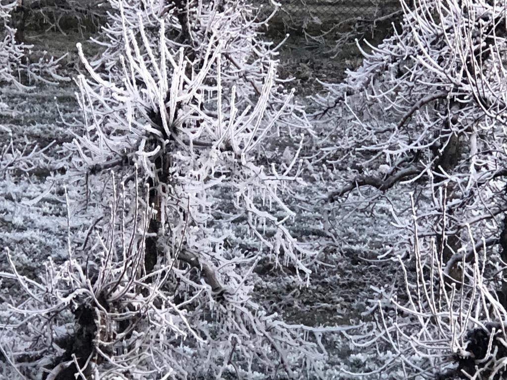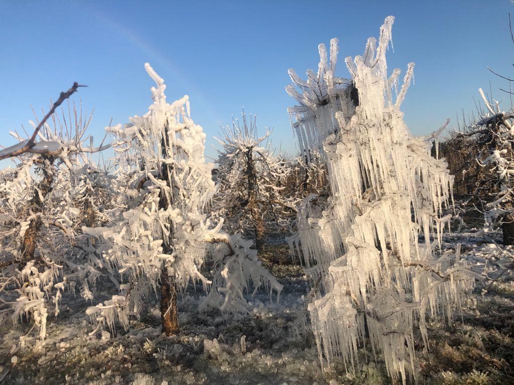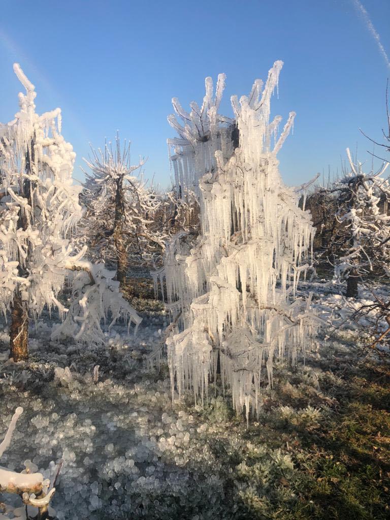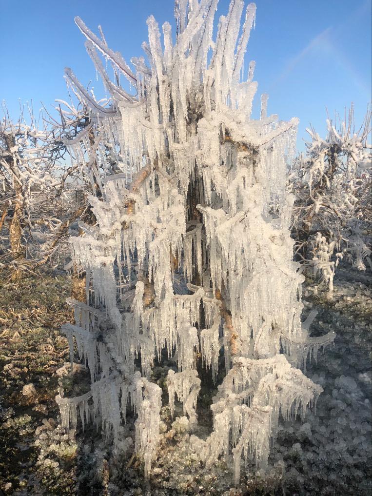 Ostatnie dni pokazały, że sadowników można jeszcze zaskoczyć. A jak zwykle, okazało się, że najbardziej zaskakuje natura. Część sadowników zdecydowała się chronić jabłonie przed przymrozkami za pomocą zraszania nadkoronowego. Niestety, lód trudno topnieje w tak niskich temperaturach – w kwaterach zacienionych lód utrzymuje się od… soboty.
