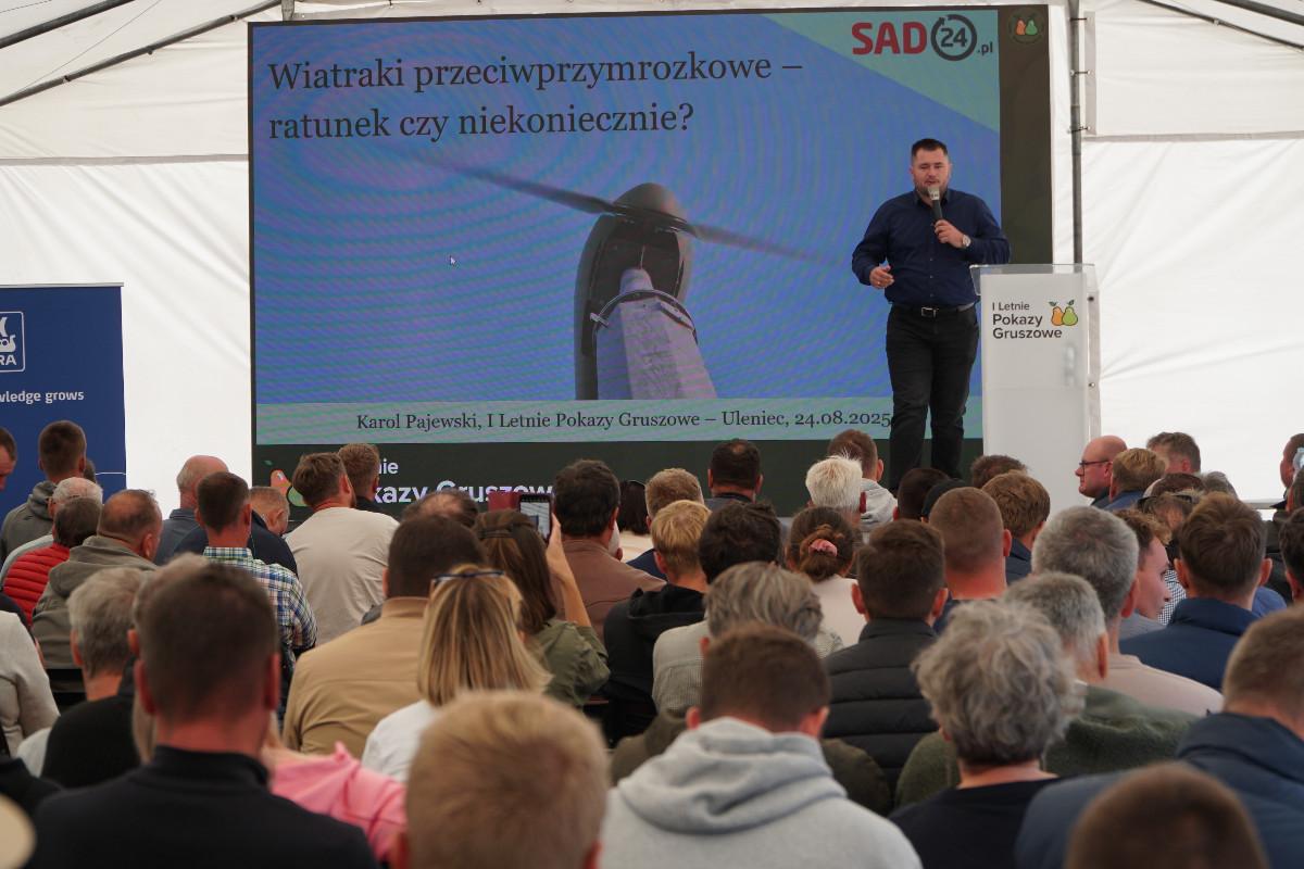 Po warsztatach praktycznych przenieśliśmy się do miejscowości Czekaj na część konferencyjno-wystawową. Serię wykładów rozpoczął gość z Holandii - Rene Albers (Fruitconsult). Opowiedział o strukturze upraw i sytuacji na tamtejszym rynku gruszek, ale skupił się przede wszystkim na regulatorach wzrostu. Następnie Karol Pajewski (SAD24) opowiedział o wadach, zaletach, cenach i ofercie wiatraków przeciwprzymrozkowych dostępnych na polskim rynku. Z kolei Arkadiusz Sławiński (UPL) omówił ochronę gruszek przed chorobami przechowalniczymi i wyzwaniach, jakie stoją przed producentami owoców tego gatunku.