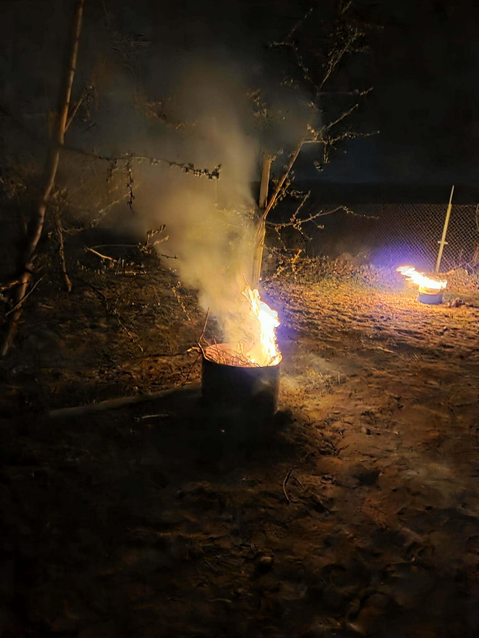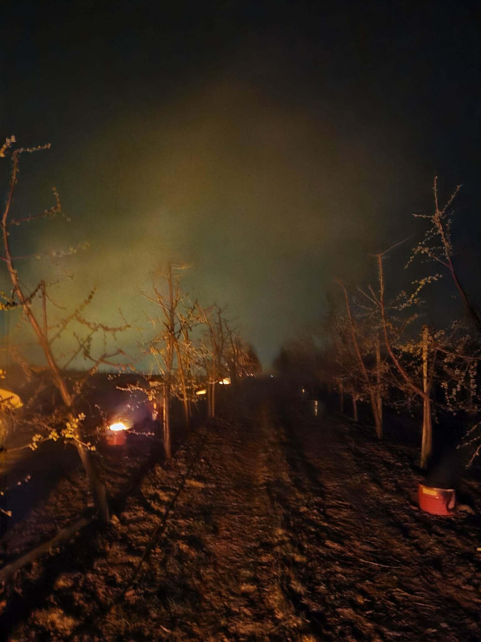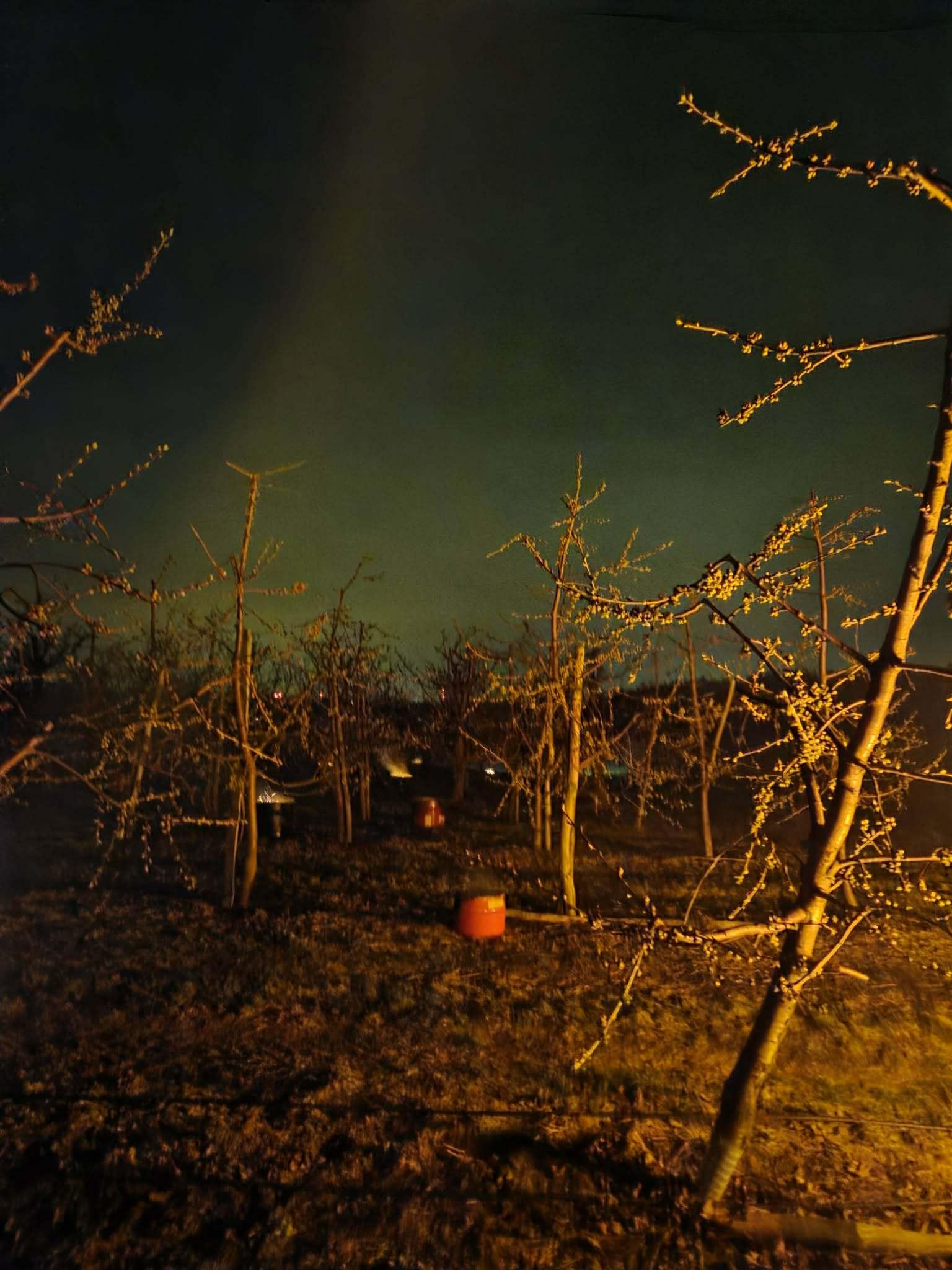Ochronę podejmowano również w sadach czereśniowych. Tam najczęściej wybierano zadymianie. Wielu producentów zdecydowało się działać dlatego, że prognozy zapowiadały jeszcze niższe temperatury i nie chcieli czekać do rana z decyzją. Zdjęcia z powiatu kolskiego (Wielkopolska).