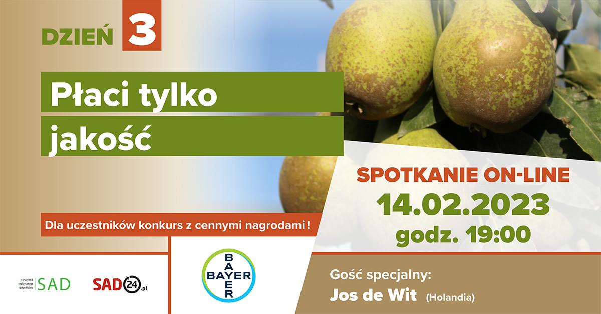 We wtorek, 14 lutego, zapraszamy na kolejne wydarzenie z cyklu Sadowniczy Tydzień Online. W roli ekspertów tego dnia wystąpią: doradca sadowniczy z Holandii Jos de Wit, który m.in. podejmie temat przerzedzania chemicznego gruszek, a także Tomasz Gasparski z Bayer, który omówi strategię ochrony grusz przed najważniejszymi chorobami i szkodnikami.