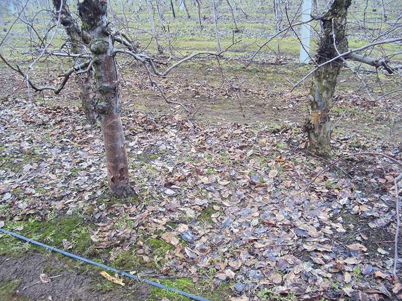 Jeśli w sadzie, w którym w minionym roku był problem z parchem i nie wykonano zabiegu mocznikiem jesienią, to powinno się przeprowadzić go w lutym lub na początku marca, opryskując leżące pod drzewami liście (fot. 3) przy użyciu belki herbicydowej, używając nieco większego stężenia nawozu. Mimo, że w tym terminie nie osiągnie się już takiej skuteczności zabiegu (niemożność dotarcia cieczy do liści leżących po drzewami wielowarstwowo), jednak warto go wykonać.