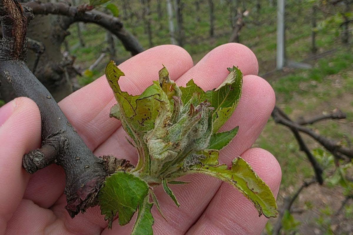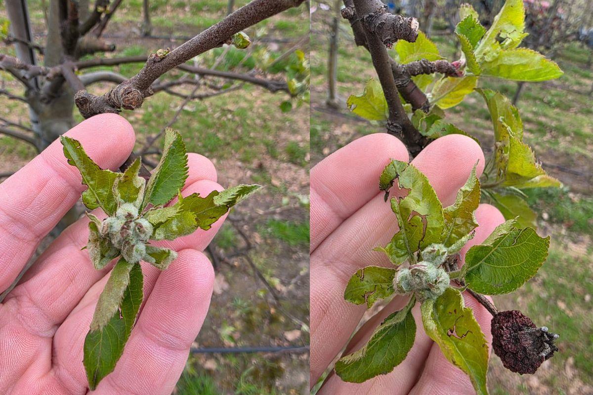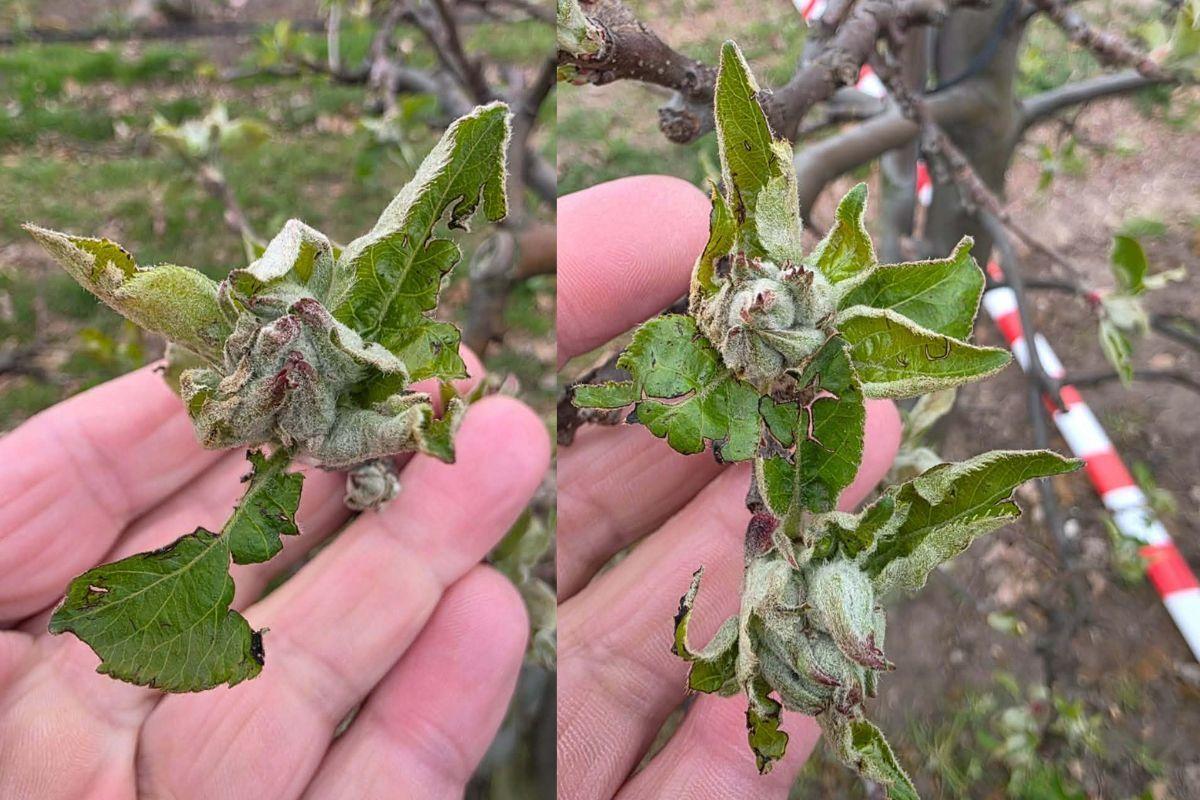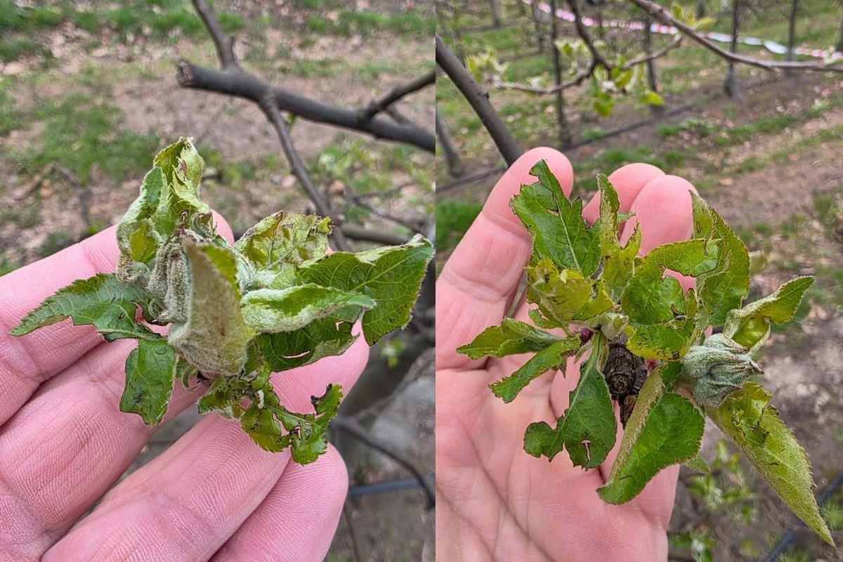 Zdjęcia pokazują też, że nie była to wyłącznie krupa śnieżna. Mimo bardzo wczesnej pory jak na początek kwietnia w sadach spadł grad o dużej średnicy, który zostawił ślady na młodych liściach.