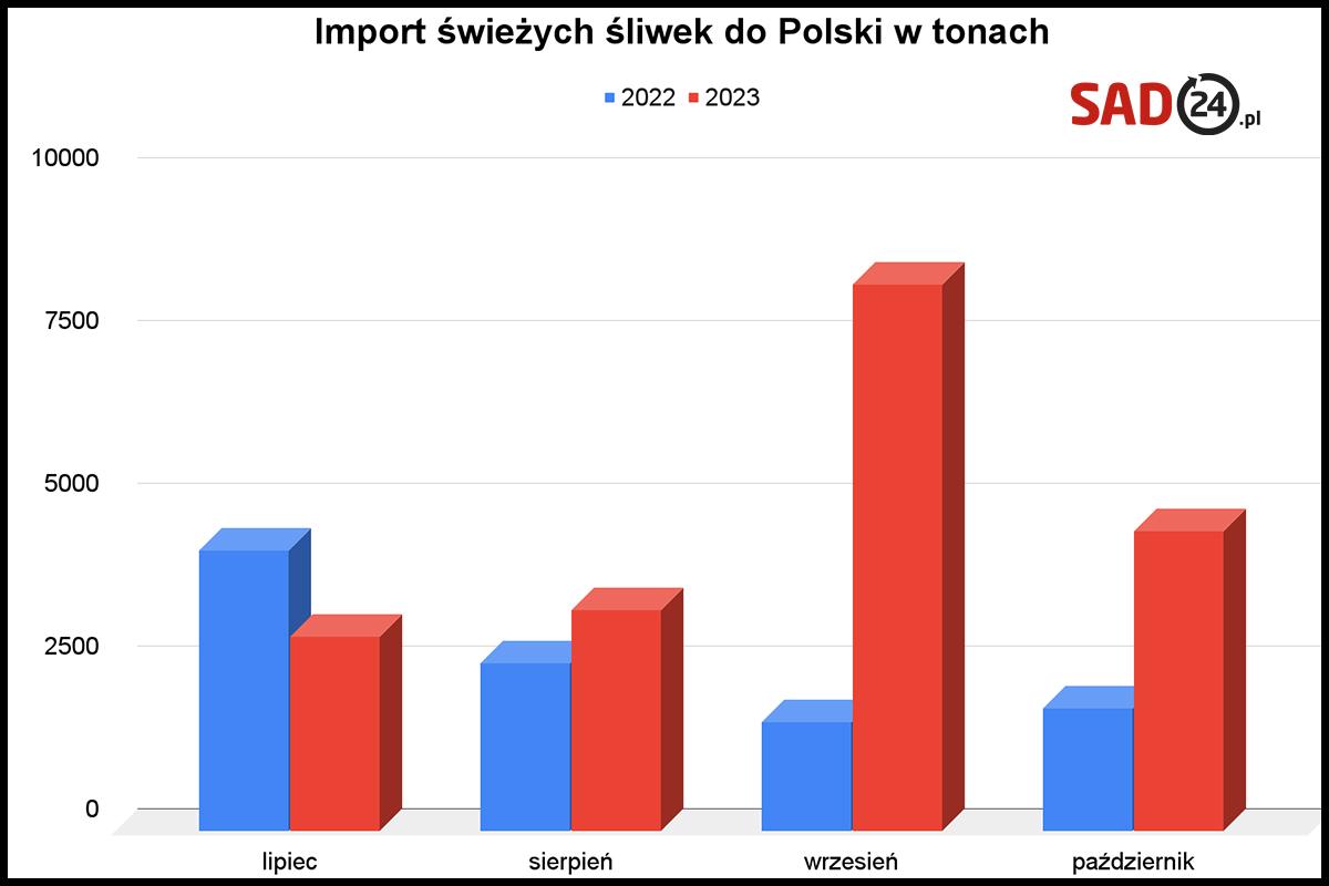 Aby najlepiej zaobserwować zmiany przenieśliśmy dane GUS-u na diagramie. Widzimy na nim import śliwek w sezonie 2022 i 2023. Ogółem w obecnym sezonie importerzy sprowadzili do kraju niemal dwa razy tyle owoców niż przed rokiem. 19,4 tys. ton zamiast 10,4 tys. ton.