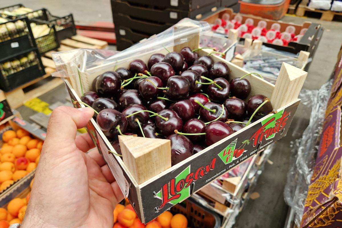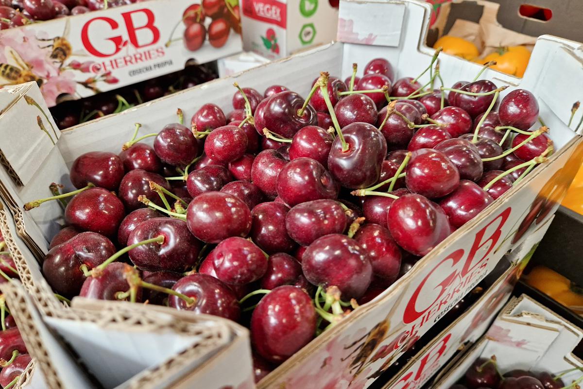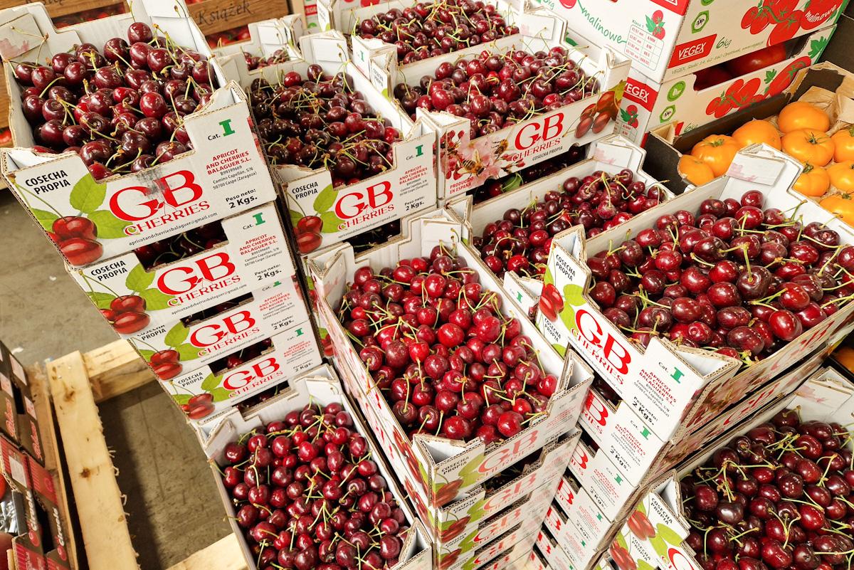 W mniejszości były owoce jakości premium. Czereśnie z Hiszpanii pakowane w kartony o masie 1 lub 2 kg oferowane były od 60,00 do 70,00 zł/kg. To właśnie z tych cen biorą się głośne w mediach stawki na targowiskach rzędu 150 czy 200 zł/kg w detalu. Owoce, o których mowa to towar najwyższej jakości. Jednak jak widać na zdjęciach, trasa z Hiszpanii i sprzedaż w Polsce sprawiły, że są już nieco „zmęczone”...