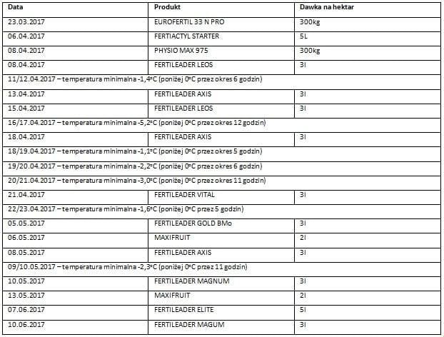 Dodatkowo P. Baryła zwraca uwagę na to, że programy nawożeniowe w poszczególnych latach są modyfikowane. W tym roku niskie temperatury wymusiły pięć dodatkowych zabiegów stymulujących (tabela 1.). Szczególną uwagę należy zwrócić na preparat FERTILEADER AXIS, do stosowania przed przymrozkami oraz FERTILEADER VITAL, którego zadaniem jest pomoc roślinie w wyjściu ze stresu spowodowanego niskimi temperaturami. Gospodarz dodaje, że korzysta z norweskich map pogodowych, które w jego przypadku sprawdzają się w około 90%.