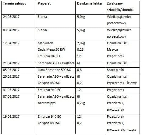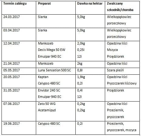 Tabela 2. Program ochrony ,,maksymalny plon i jakość” na odmianie ‘Jubilejnaja Kopania’