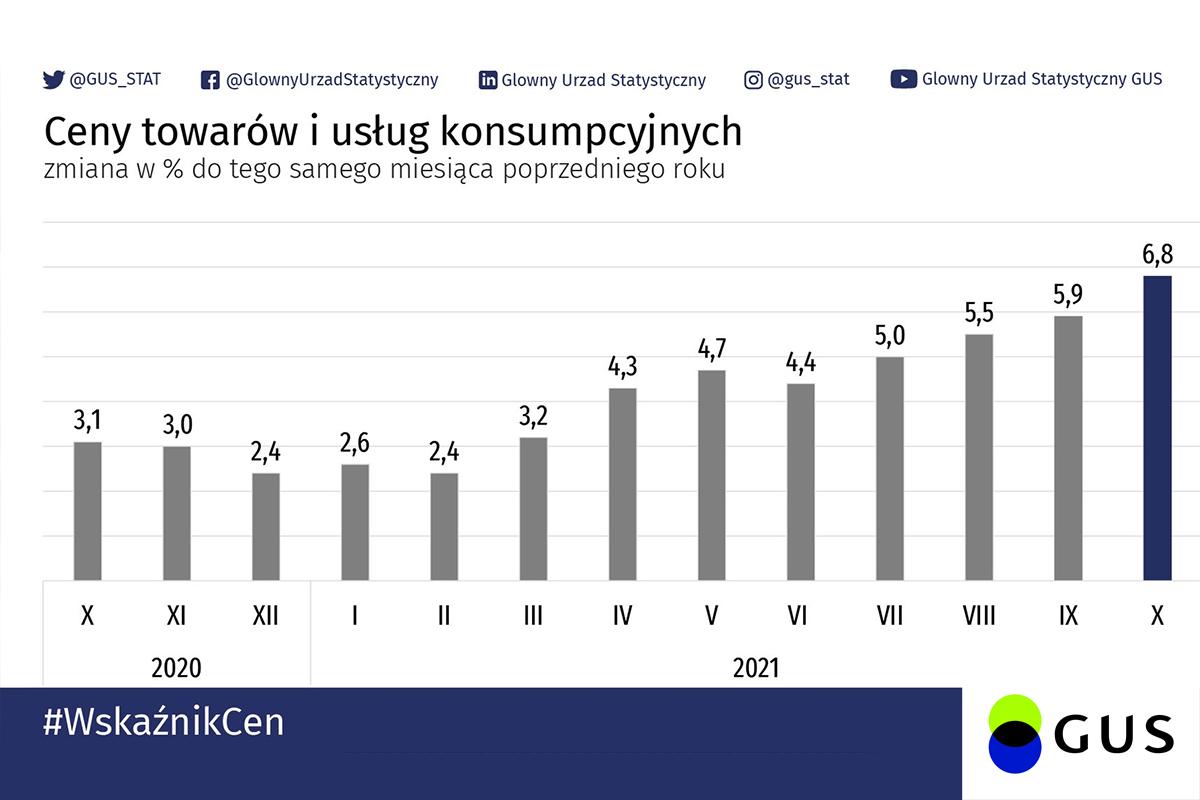 Jak podaje GUS, inflacja w październiku wyniosła rekordowe 6,8% w stosunku rok do roku. Wynik przekroczył najwyższe prognozy analityków. Inflacja nie tylko rośnie i dzieje się to coraz szybciej.