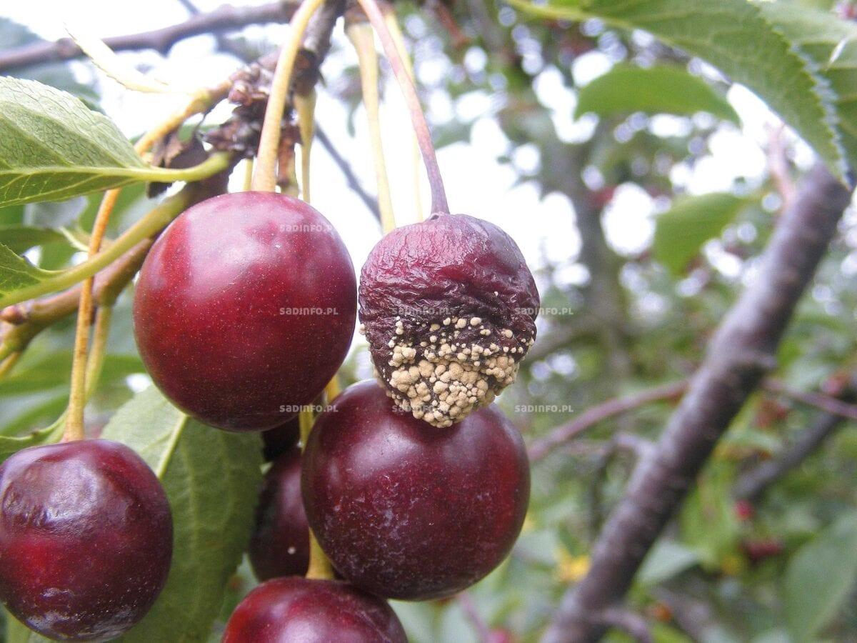 Pierwotnym źródłem infekcji są chore, przerośnięte grzybnią pędy i zeszłoroczne, poczerniałe owoce, zwane pospolicie mumiami, zaschnięte na gałęziach lub leżące pod drzewami. Wiosną infekcji kwiatów przez słupki i pylniki dokonują zarodniki konidialne tworzące się na nich. Po 2 lub 3 dniach od infekcji kwiaty brunatnieją, zasychają i pozostają na drzewie. Z nich poprzez szypułki grzybnia przerasta do krótkopędów i pędów jednorocznych, powodując nekrozę kory i zamieranie ich powyżej miejsca infekcji. Objawem choroby są wygięte pędy z suchymi i sztywnymi liśćmi, zaschniętymi kwiatami oraz zamierające zawiązki. Na porażonych organach wśród zbitej grzybni tworzą się beżowoszare kuleczki, skupiska wtórnych zarodników konidialnych, które następnie zakażają dojrzewające owoce. W ten sposób zaczyna się drugi etap choroby. Infekcja owoców następuje poprzez przetchlinki w skórce, jej pęknięcia lub uszkodzenia będące skutkiem żerowania owadów, gradu, czy nagłych i obfitych opadów deszczu. Na zakażonych owocach powstają koncentrycznie ułożone, liczne, brodawkowate, kuliste, pylące skupiska grzybni i zarodników konidialnych (fot. 1), dokonujące infekcji następnych owoców, czemu sprzyjają wysoka temperatura i wilgotność powietrza (deszcze, mgły). Wśród wiśni odmianą szczególnie podatną na tę chorobę jest ‘North Star’, ale w poprzednim sezonie również na drzewach ‘Łutówki’ gnilne objawy chorobowe występowały powszechnie. Zdarzało się, że i na pędach wiśni znaleźć można było inny objaw porażenia drzew: gumowanie w kolorze bursztynu (fot. 2). Porażone owoce opadały z drzew, ale te które zostały i przylegały do pędu, prowadziły do zgorzeli kory.