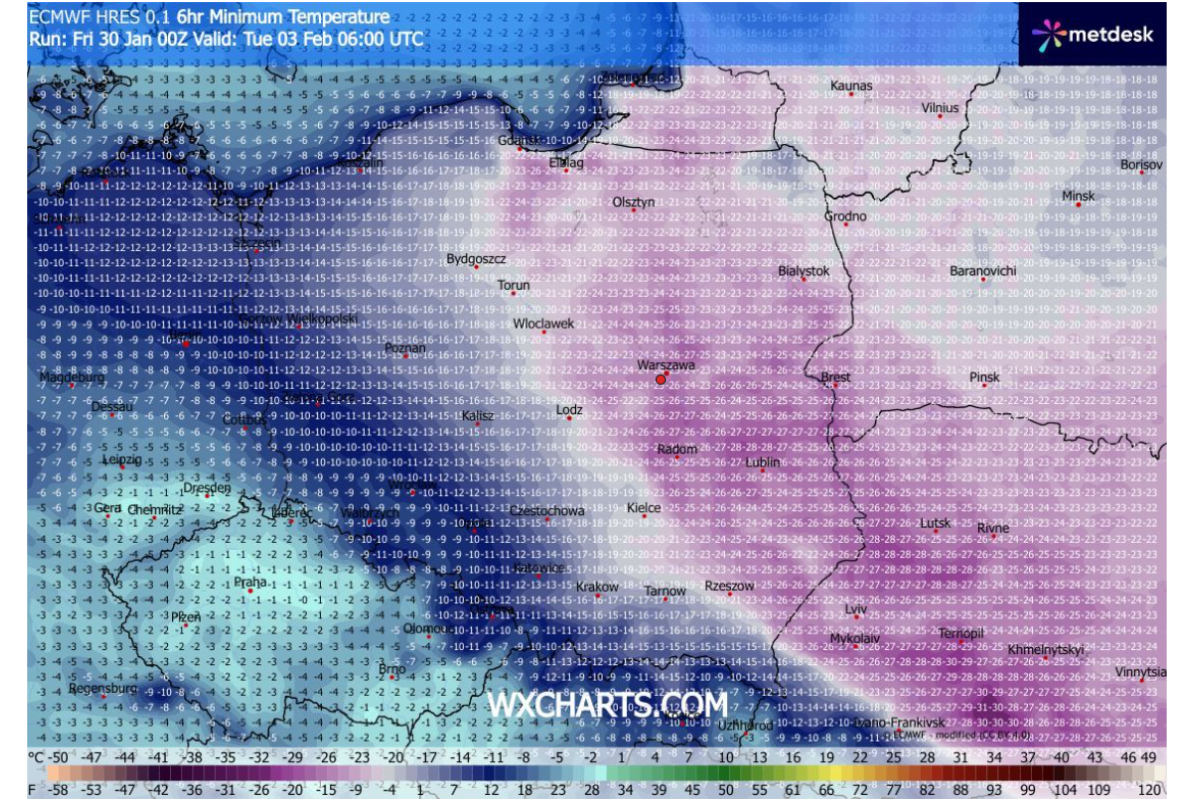 Jeszcze zimniej ma być we wtorek rano (03.02.2026). Skrajne wyliczenia prognozują w tym przypadku w rejonie Grójca -25/-27°C. O jeden lub dwa stopnie zimniej ma być w województwie lubelskim. Ponadto w nocy z niedzieli na poniedziałek fali mrozów będzie towarzyszyć pełnia księżyca. Niewykluczone, że przy bezchmurnym niebie lokalnie temperatura spadnie do -30°C.