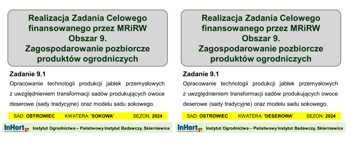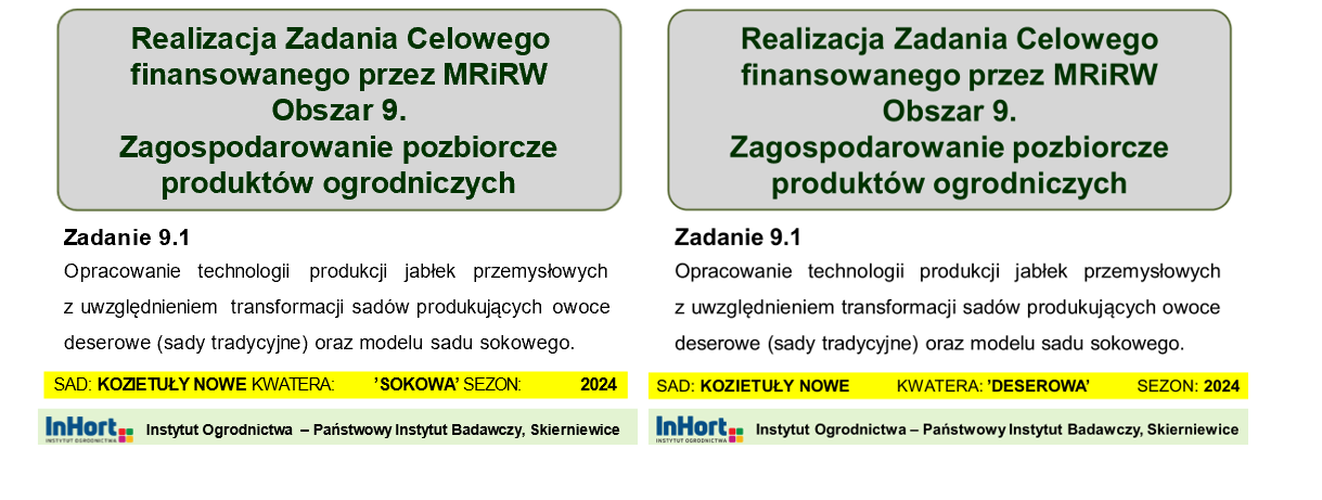 W 2024 r., w obydwu lokalizacjach wykonano obserwacje pod kątem występowania szkodników i chorób grzybowych. Zebrano owoce i oceniono ich jakość oraz założono doświadczenia przechowalnicze. Zgodnie z założeniami projektu, w 2024 r., wyprodukowano soki mętne z owoców pochodzących z kwater sokowych i deserowych, przy czym z kwatery sokowej jako odrębne kombinacje użyto jabłek zdrowych (bez oznak chorób grzybowych) i jabłek z wyraźnym porażeniem przez parcha jabłoni.