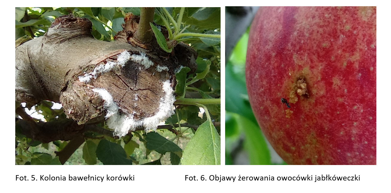 W sadzie zlokalizowanym w Ostrowcu zaobserwowano wystąpienie bawełnicy korówki (fot. 5), przy czym jej liczebność była wyraźnie większa w kwaterze sokowej niż IP. Również sumaryczna liczba odłowionych motyli zwójkówek w pułapki z feromonem była zdecydowanie wyższa w kwaterze sokowej. Ponadto, w kwaterze sokowej odnotowano zdecydowanie wyższy procent owoców uszkodzonych przez owocówkę jabłkóweczkę (fot. 6) w porównaniu z sadem IP, natomiast procent owoców uszkodzonych przez zwójki był podobny w obu typach sadów.