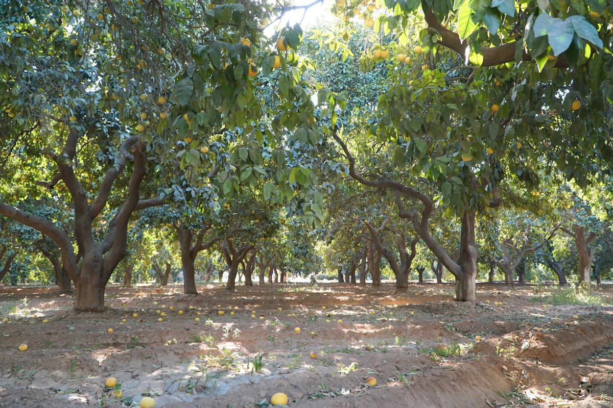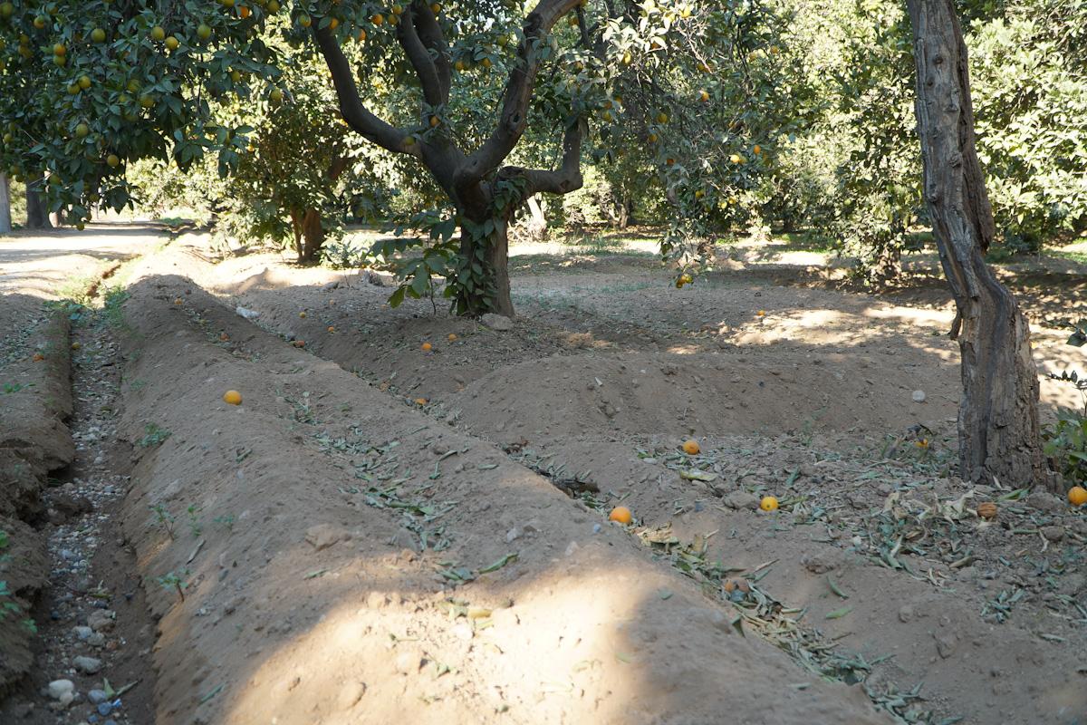 Od lat tamtejsi sadownicy stosują narzędzie w typie talerzówki, które zostawia dwa głębsze rowy po obu bokach, co doskonale widzimy na dwóch poniższych zdjęciach. W miesiącach letnich, gdy praktycznie nie pada, temperatura wynosi około 30 stopni w dzień, ale rzadko spada poniżej 25 stopni. Sadownicy cyklicznie „zalewają” sady, żeby drzewa mogły utrzymać owoce i przetrwać w dobrej kondycji do listopadowych zbiorów.