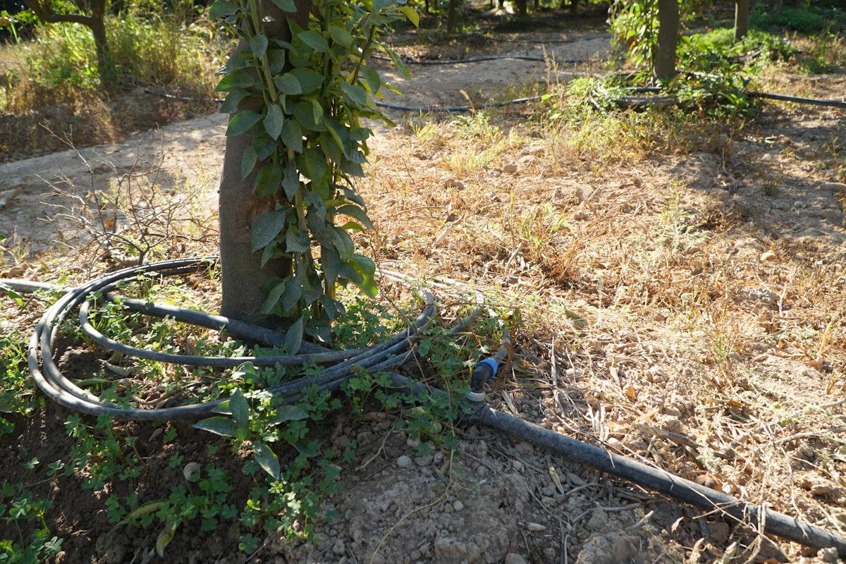 Drzewa cytrusowe mają rozbudowany system korzeniowy. Dlatego w odwiedzonym instytucie i w większych sadach stosuje się nawadnianie kropelkowe. Jednak jedna czy dwie linie kroplujące to zbyt punktowa dawka dla rozbudowanego systemu korzeniowego. Dlatego na południu Turcji stosuje się swego rodzaju „wpinki” do rur o większej średnicy i owija wokół drzewa, co widzimy na kolejnym zdjęciu.