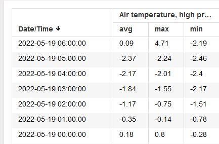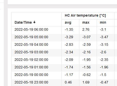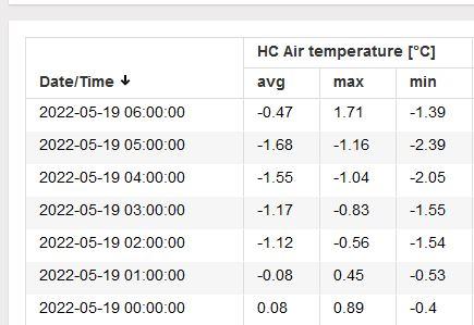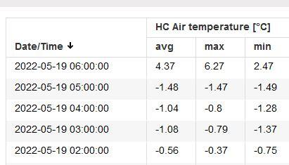 Niżej dokładne dane ze stacji pogodowych z Bielan koło Błędowa (i innych miejscowości). Jak widzimy temperatura spadła poniżej zera jeszcze przed północą. Tuż po wschodzie słońca, czyli o 5:00 nad ranem spadła do poziomu niemal -3,30 stopnia Celsjusza. Mróz trwał zatem ponad 6 godzin na wysokości 1,5 metra. Przy gruncie temperatura była niższa.