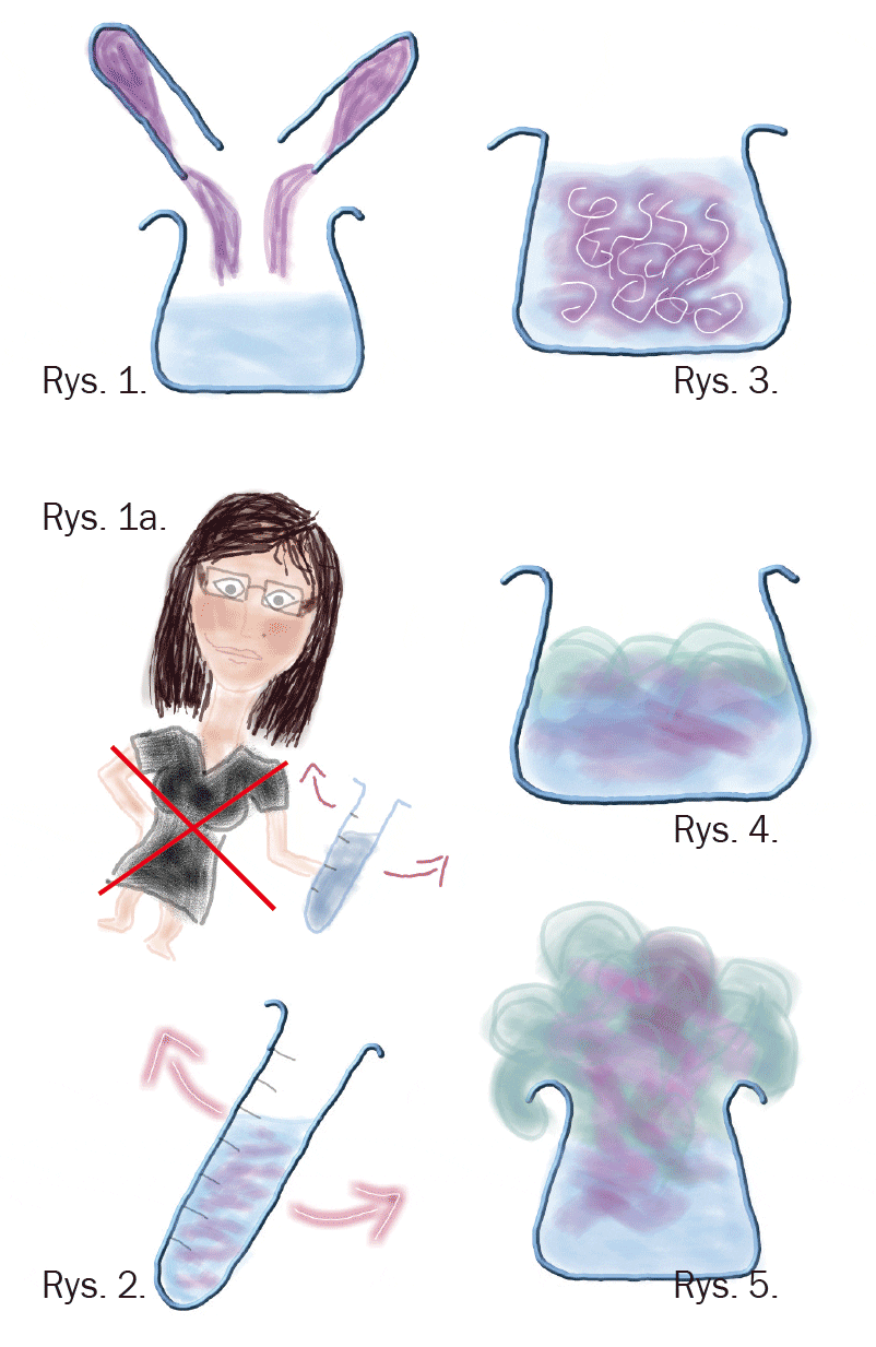 Podczas mieszania (rys. 1) obserwujemy powstały roztwór, czy jest klarowny (rys. 2), w jakim czasie doszło do jego doskonałego zmieszania, czy na wierzchu tworzy się piana itp.