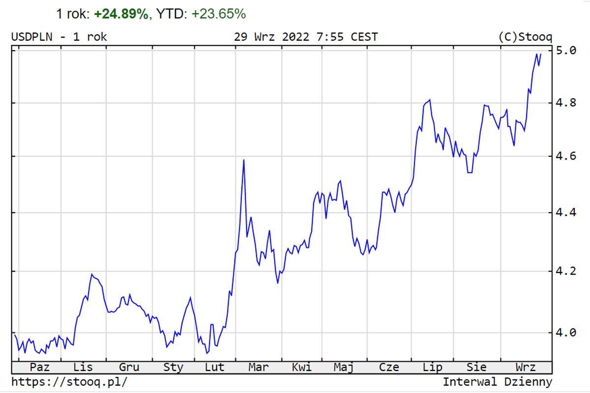 Wczoraj głównym tematem wśród ekonomistów i maklerów giełdowych był kurs dolara. Ten po raz pierwszy w historii przekroczył barierę 5,00 zł. Co dla nas właściwie oznacza taki „rajd” dolara widoczny na wykresie niżej?