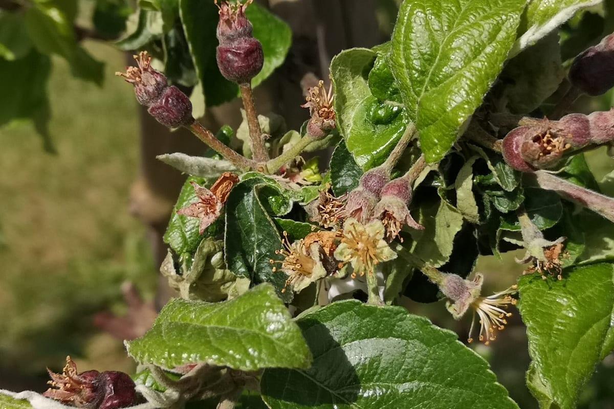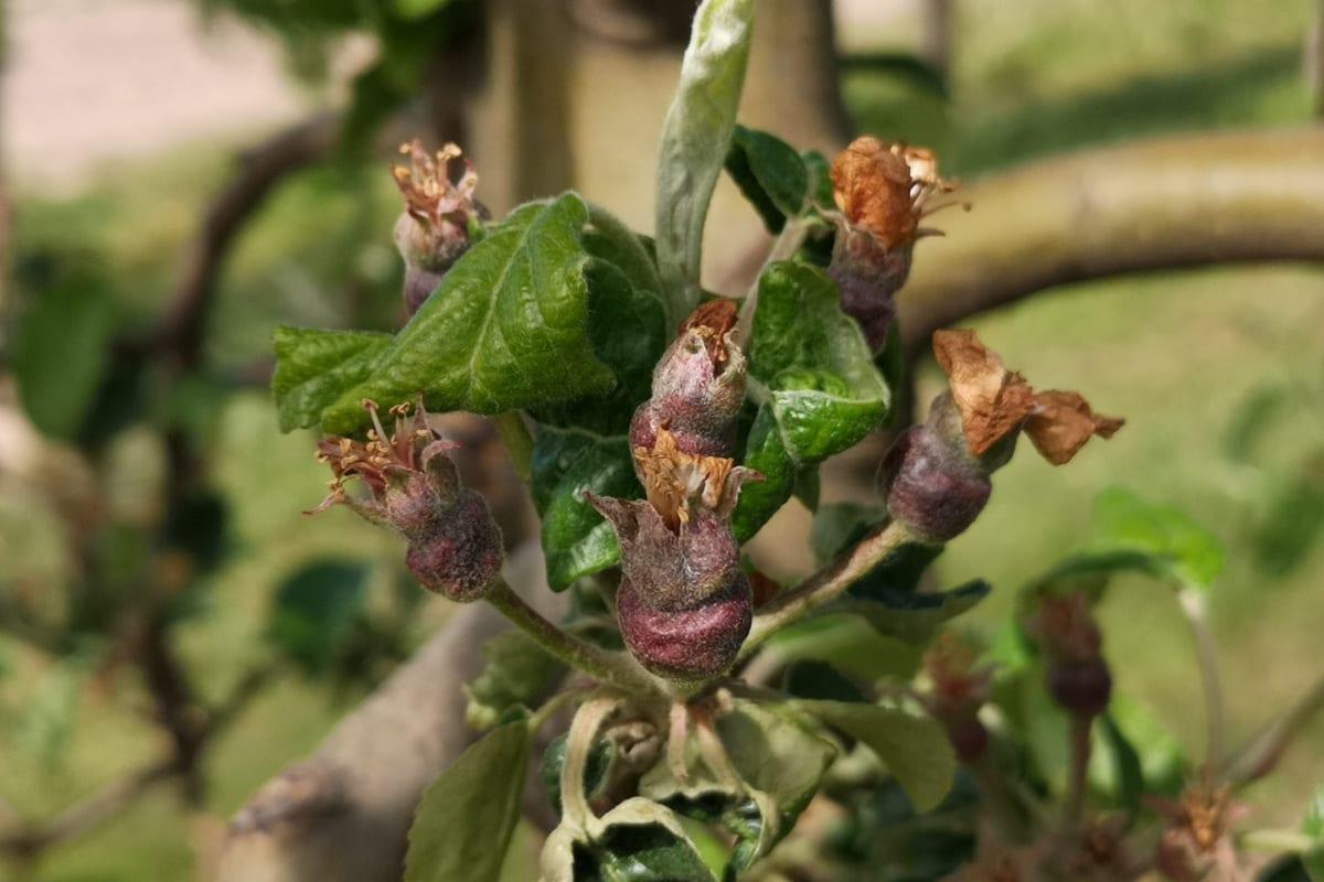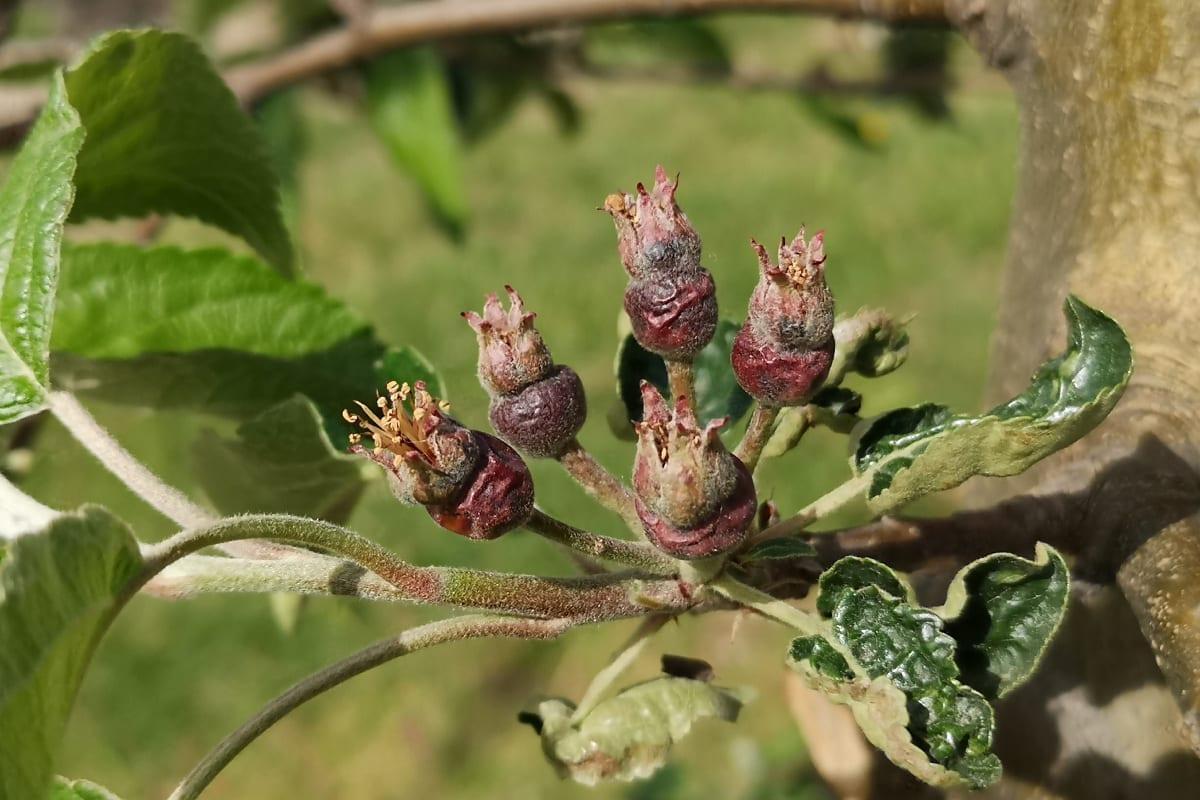 Na innych odmianach, które są nie są tak zaawansowane w rozwoju zawiązków znacznie trudniej ocenić stopień strat. Jedynie po dotknięciu zawiązka można uznać, że jest znacznie bardziej miękki, niż te nieuszkodzone.