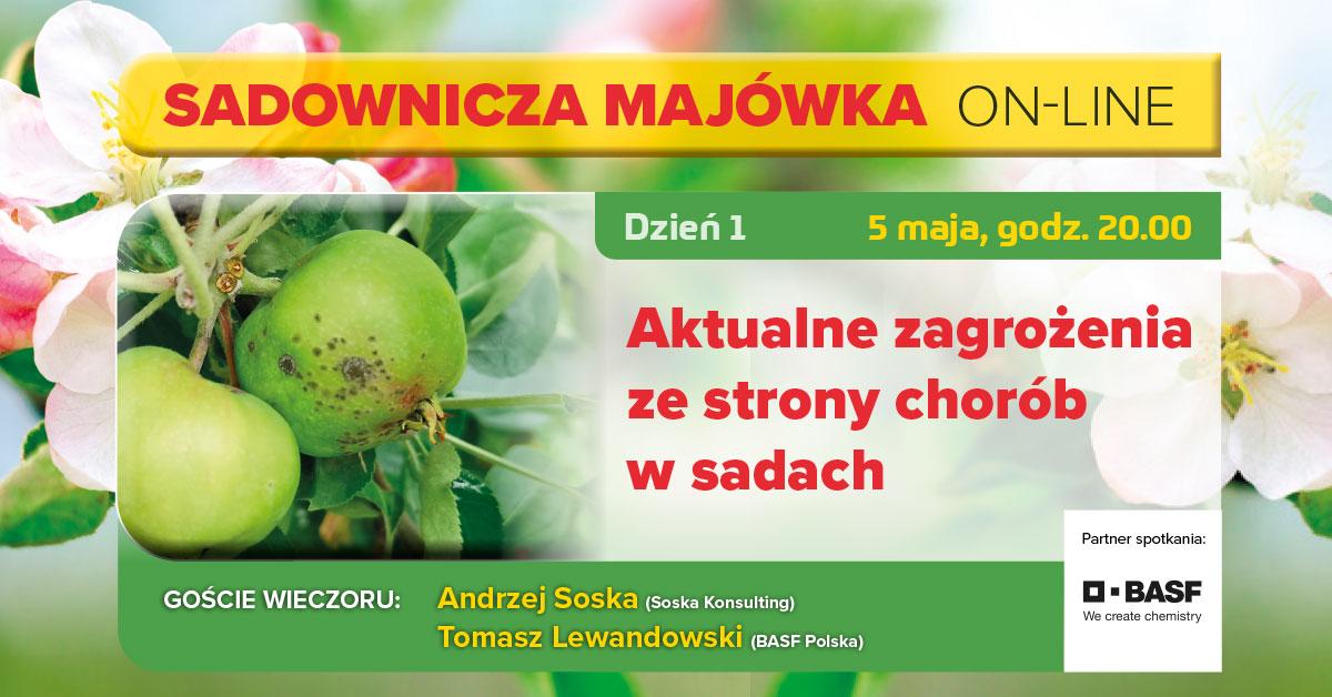 Inauguracyjne spotkanie w ramach Sadowniczej Majówki on-line poświęcone będzie chorobom w sadach jabłoniowych. Zapraszamy już 5 maja, o godz. 20.00. Gośćmi wieczoru będą: doradca sadowniczy Andrzej Soska i Tomasz Lewandowski Fruit Crop Manager, BASF Polska.