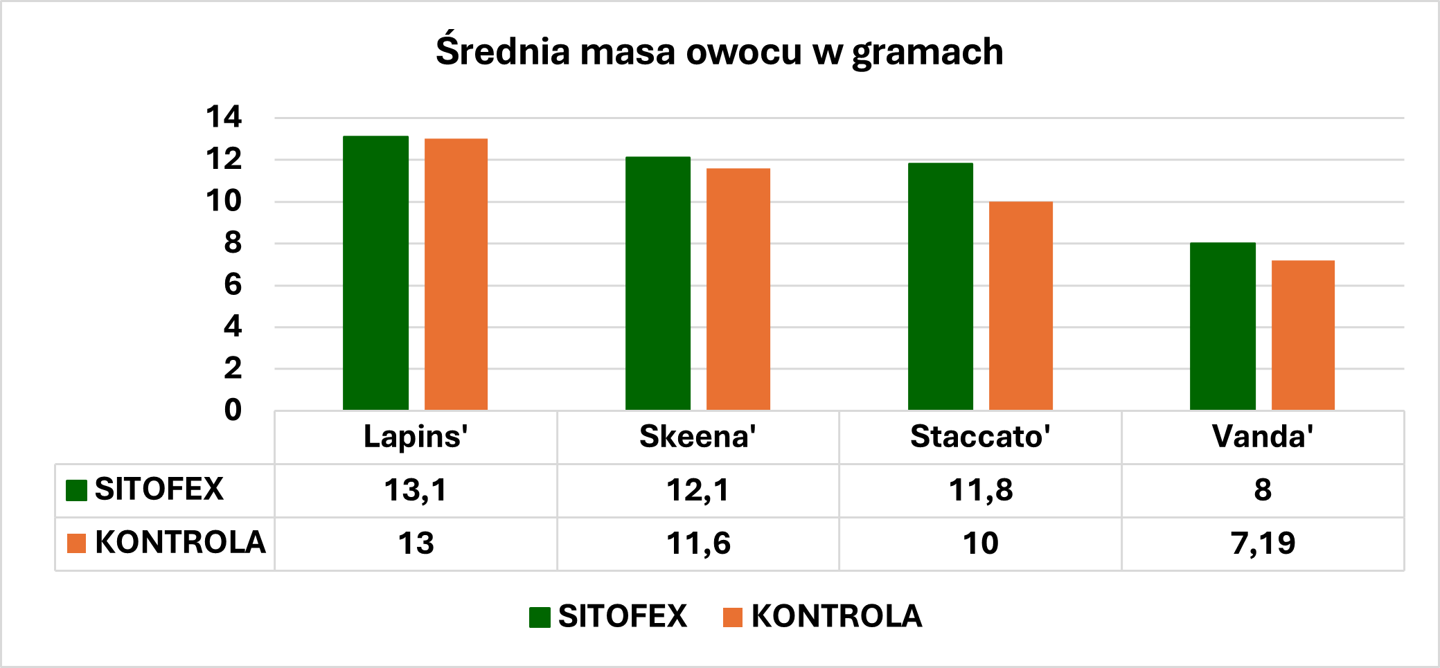 - Masa pojedynczego owocu wzrosła o 11–13%, co przełożyło się na zauważalny wzrost plonu handlowego.