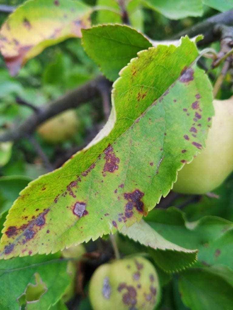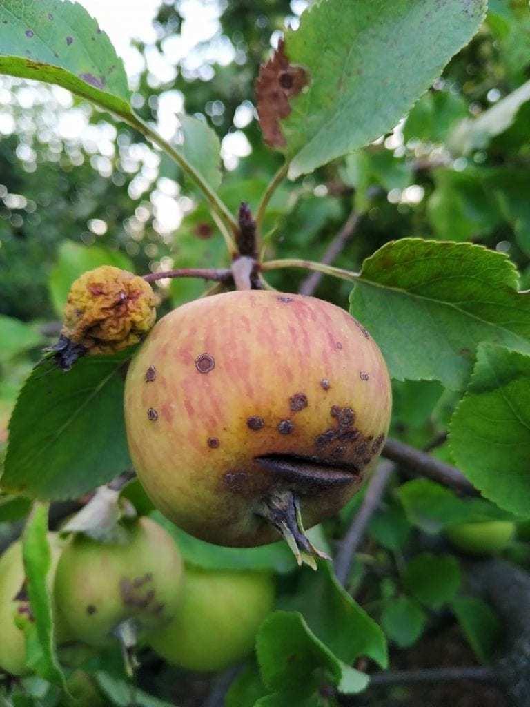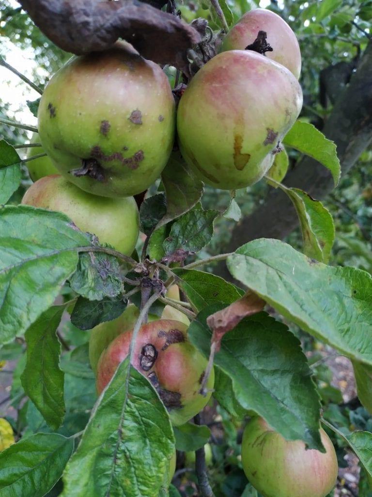W niechronionym sadzie pierwszy rzuca się w oczy parch jabłoni. Są zarówno plamy na skórce ale także i większe deformacje. Warto dodać, że wyjątkowo suchy 2019 rok nie jest przyjazny dla grzybów Venturia Inaequalis. Końcówki pędów zaatakowane są przez mączniaka jak również i mszyce. Przyglądając się liściom można dostrzec niedobory wielu mikroelementów.